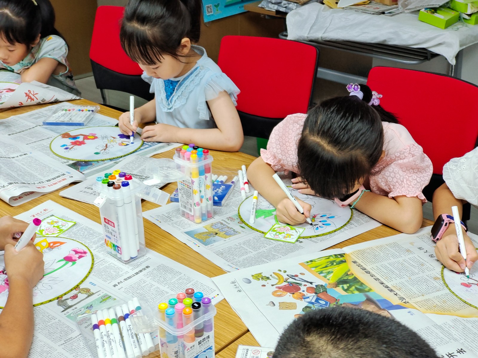 活动中,志愿者老师向小朋友们讲解了团扇的“前世今生”,帮助大家领会团扇绘画的文学底蕴和美学价值。随后,老师对团扇的制作过程和技巧进行了详细的讲解。孩子们根据自己的创意将色彩点缀在空白的团扇上,并在周围用小珍珠装饰,一把把充满非遗文化韵味的扇面就此诞生了。在手工环节中,小朋友们心灵手巧,将一些中国传统文化元素的诗词、装饰画等小部件,与团扇相结合,拼贴成一幅幅精美的非遗文创作品,可谓是画中有诗,诗中有画,同时让小朋友们领略到了经典古诗词与中国传统文化的魅力。团扇轻摇,清风徐徐,一抹抹浓烈的色彩为即将到来的盛夏送出一丝丝清凉。