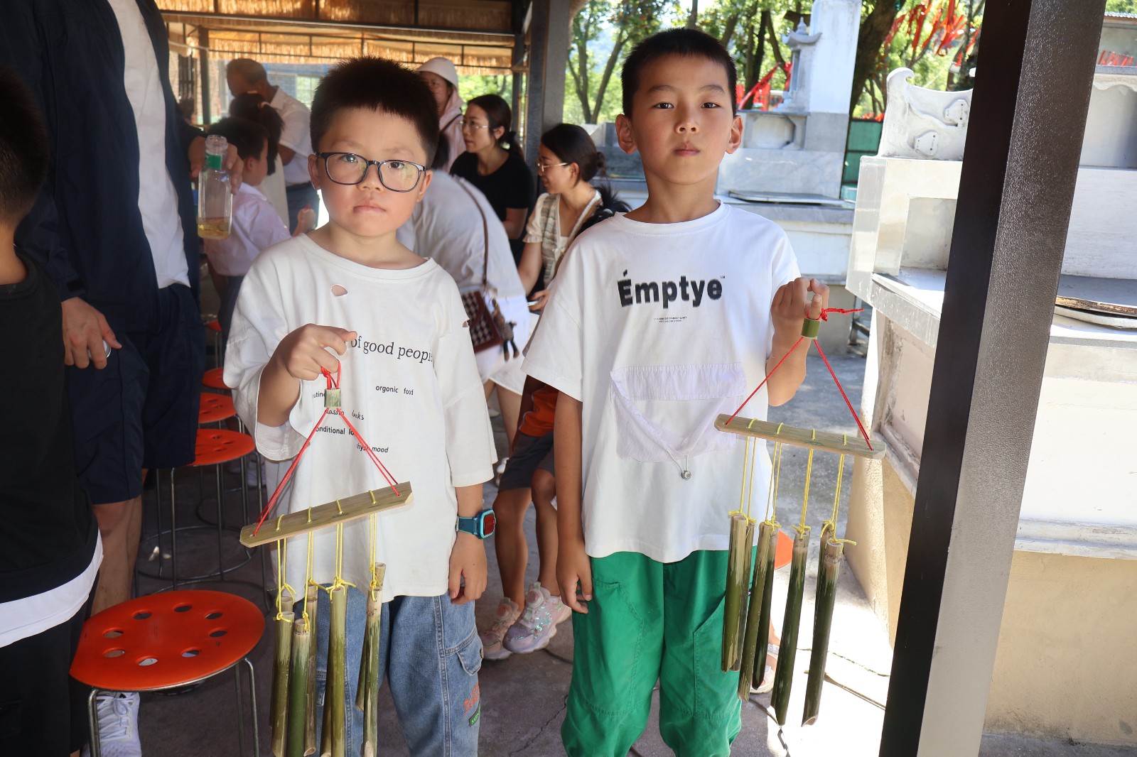 随后,翁老师示范了竹风铃的制作方法和注意事项,孩子们在家长的帮助下亲手体验了如何将一节节的竹子制作成风铃,抛光、穿线不亦乐乎。这个过程不仅让孩子们学会了竹艺的基本技艺,更重要的是,他们深刻体会到了“慢工出细活”的道理以及传统手工艺背后的匠心独运。