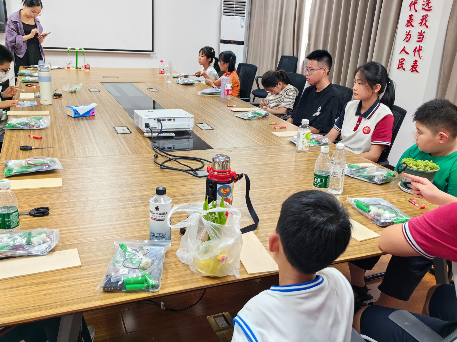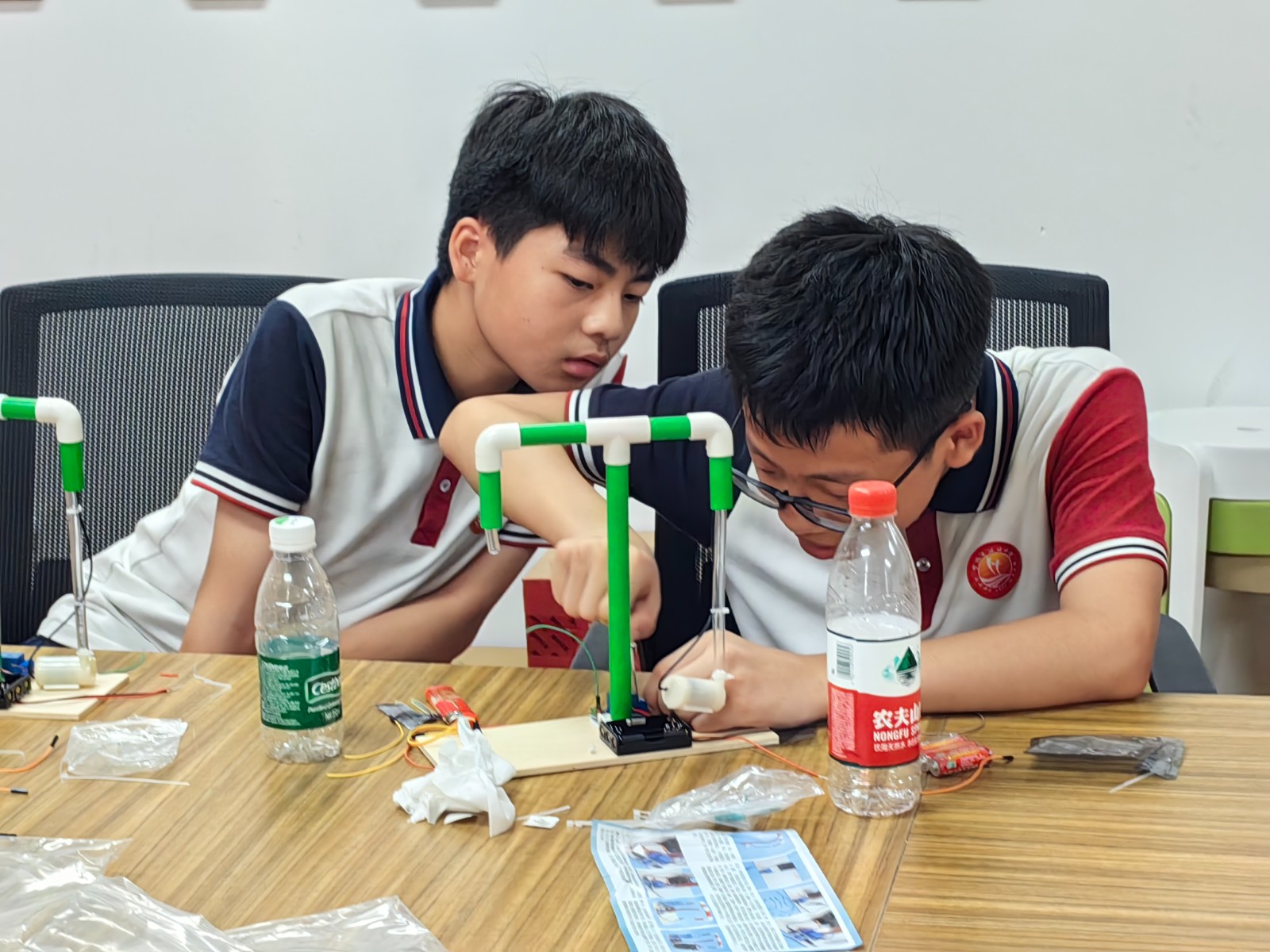 活动现场,13位同学分成四组,一个半小时的团队协作下大家都完成了自助浇花施水器的制作。在施水器成功通电输水的那一刻,孩子们脸上洋溢着满足的笑容,这些作品不仅是他们对手工成品的满意,更是他们对大自然的热爱和关爱。