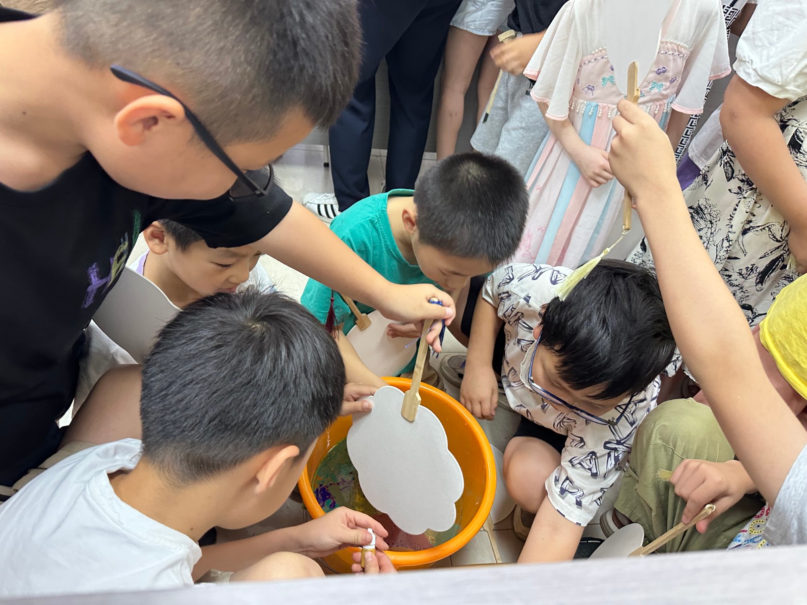 活动中,网格员向青少年们介绍了漆扇的制作流程,让他们对漆艺制作的工艺流程和艺术性有了进一步的了解,在网格员和志愿者的带领下,大家将松节油稀释调色好的漆仔细滴入清水盆中,漆漂浮在水面,大家用竹签小心挑动,盆中漆的纹路随之变化。手握准备好的小扇,调整好角度下水,沉入提转之间,漂漆团扇便制作完成,当一把把蕴含着心血与创意的漆扇展现在大家面前时,那份成就感与喜悦溢于言表。