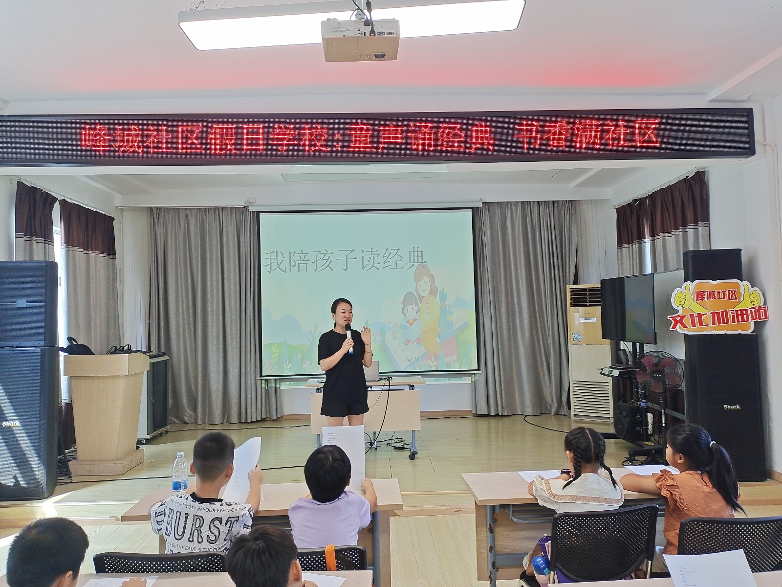 朗诵是一门艺术,它不仅能陶冶情操,更是一种精神享受,使人愉悦。“书同文,语同音,人同心”,为促进辖区未成年成长,提升未成年人朗诵水平及文学艺术素养,8月6日上午,峰城社区党群服务中心邀请区文化加油站虞碧芬老师为辖区未成年人开展“书香满社区 童声诵经典”未成年人朗诵培训活动。