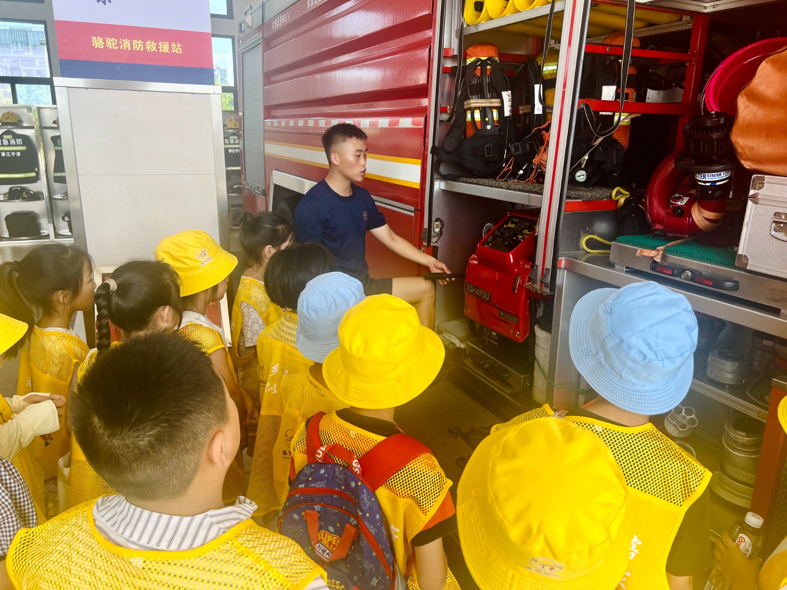 一进入消防大队,孩子们就被高大威猛的消防车和各式各样的救援装备深深吸引。消防员叔叔耐心地为他们讲解了消防车的构造、不同设备的用途以及如何在火灾中迅速穿戴防护服等专业知识。