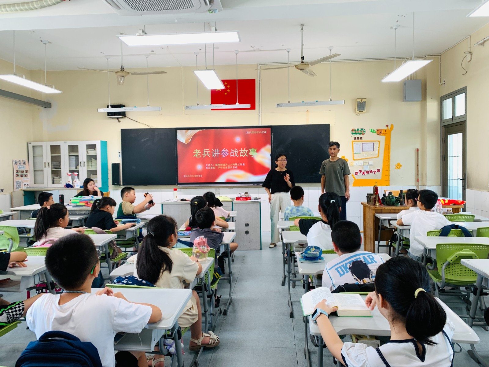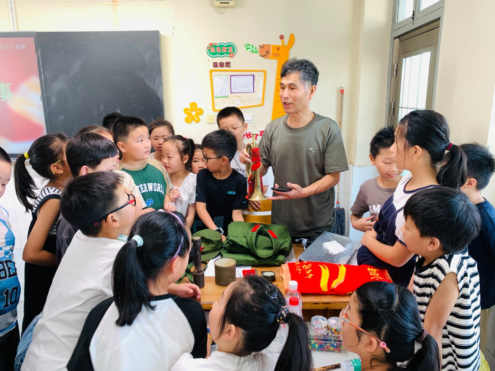 87日上午,芦中社区假日学校迎来了一位特殊的嘉宾——退役老兵李杰静。李老先生为孩子们带来了一场生动的历史课,讲述了战争年代的故事,并展示了一些珍贵的历史文物,包括水壶、钢笔、枕巾、勋章等,让孩子们亲身触摸到了那段峥嵘岁月。