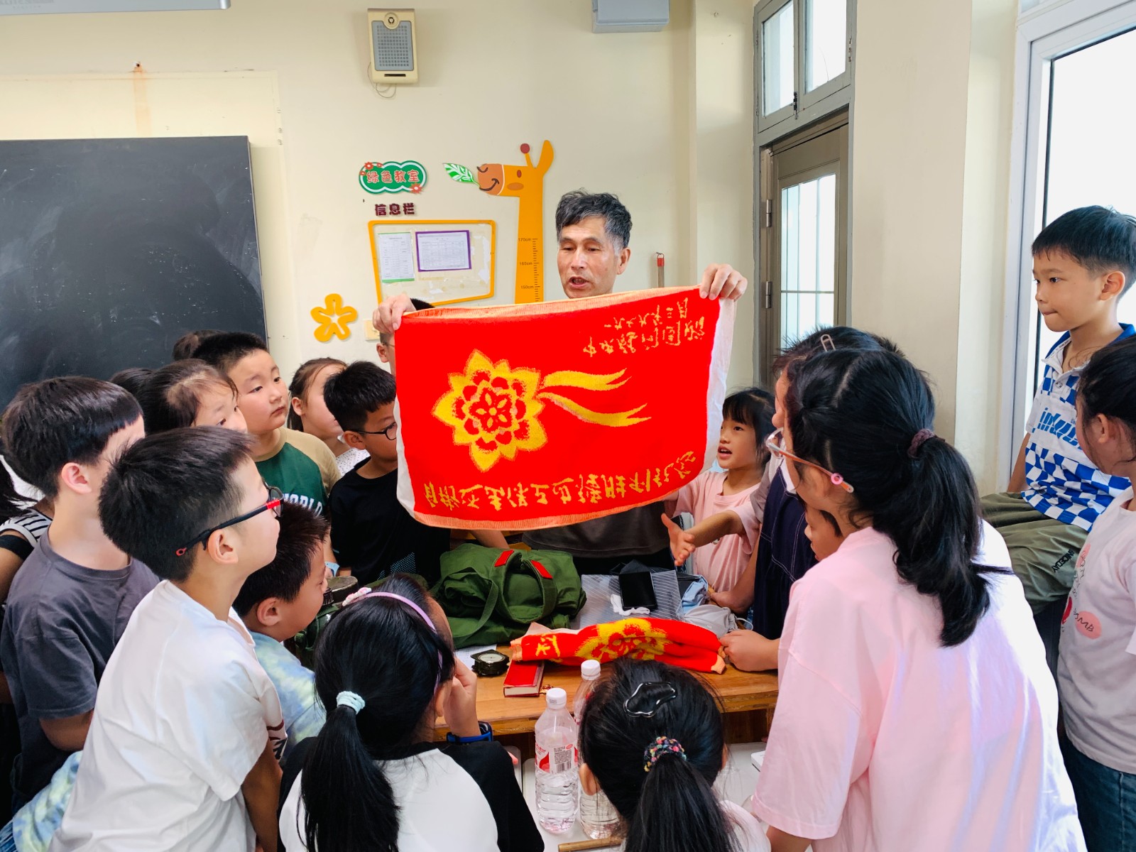 为了让孩子们更直观地了解那个年代的生活,李老先生带来了几件珍贵的历史文物:一个斑驳陆离的军用水壶,一支已经褪色的钢笔,一条印有红色五角星图案的枕巾,以及一枚枚闪亮的勋章。每一件物品背后都有着它独特的故事。比如那只水壶,它曾经陪伴李老先生度过无数个日夜;那支钢笔,则是他记录下战争点滴的工具;而那些勋章,则是对他在战场上英勇表现的肯定。