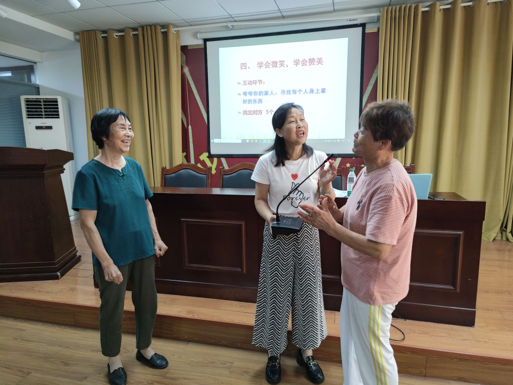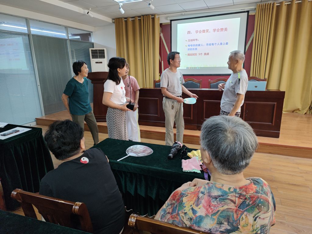 首先,老师从游戏互动导入,测试大家目前的心理状态,接着带领大家认识心理疏导的重要性,通过“情绪”和“压力”的理解询问居民们日常调整情绪与压力的方法,并从“与自我和解”,“学会微笑、学会赞美”等角度教授大家处理常见问题、化解矛盾和释放压力的有效做法,教会居民在工作和生活中如何保持良好的心态,以及当你心情不好时该怎么做等,让大家做自己情绪的主人