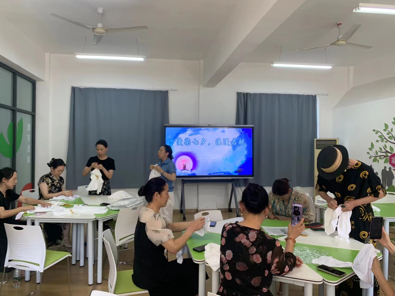 扎染,作为中华民族的传统工艺之一,拥有数千年的历史,其独特的染色技法和丰富的图案变化,一直深受人们喜爱。811日正逢七夕,为让辖区居民更深入地了解和体验中国非物质文化遗产的魅力,青墩社区党群服务中心开展“爱满七夕,浪漫启航”活动,激发辖区居民们对传统文化的兴趣与热爱,培养他们的动手能力和审美鉴赏能力。