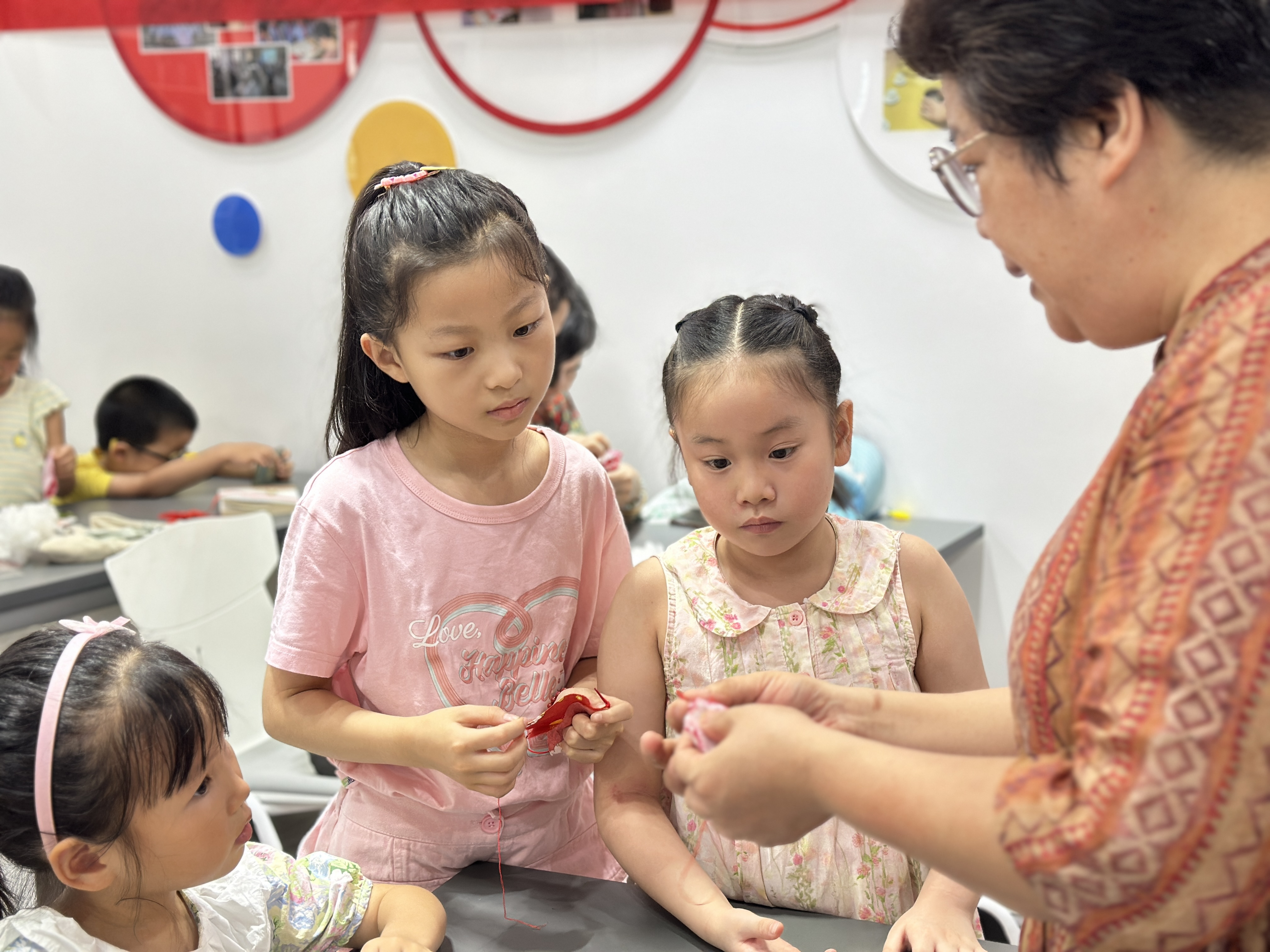 随着讲解的结束,制作环节正式开始。家长与孩子们围坐一圈,认真地聆听着指导老师的每一个步骤,从裁剪布料到填充药材,再到缝合香包,每一步都充满了耐心与细致。孩子们的小手虽然略显笨拙,但在家长的鼓励和帮助下,一个个精美的驱蚊香包逐渐成型。有的孩子还在香包上画上了自己喜欢的卡通图案,或是挂上了小巧的流苏,让香包更加生动有趣。