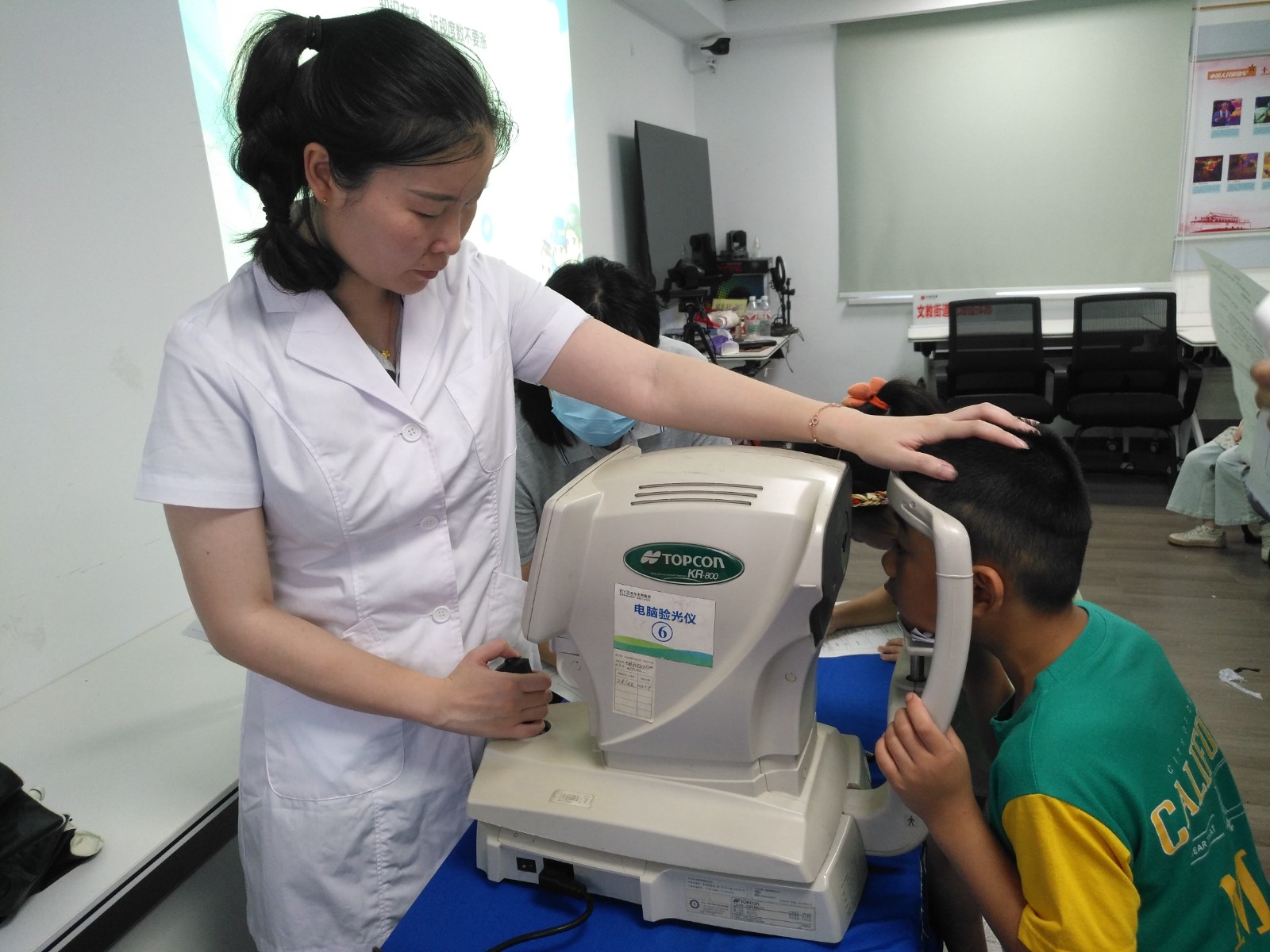 讲座中,光明眼科的医生通过PPT,图文并茂、深入浅出地向社区青少年介绍了近视眼形成原因和症状、影响因素、眼睛的保健、如何预防近视的发生发展。并提醒孩子们要注意用眼的习惯。尤其在暑假期间,科学合理地安排看电视,用电脑的时间,每隔30至40分钟就休息10-15分钟,眺望远处,让眼睛充分放松。注意眼睛锻炼坚持做眼保健操。要多吃保护眼睛的食物补充营养,不要在光线太暗的地方看书、不要经常性地点眼药水、不要使用劣质太阳镜。讲座结束后,医生还为现场的每一位青少年做了眼底检查。