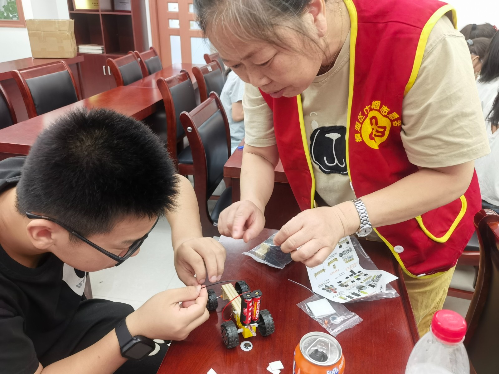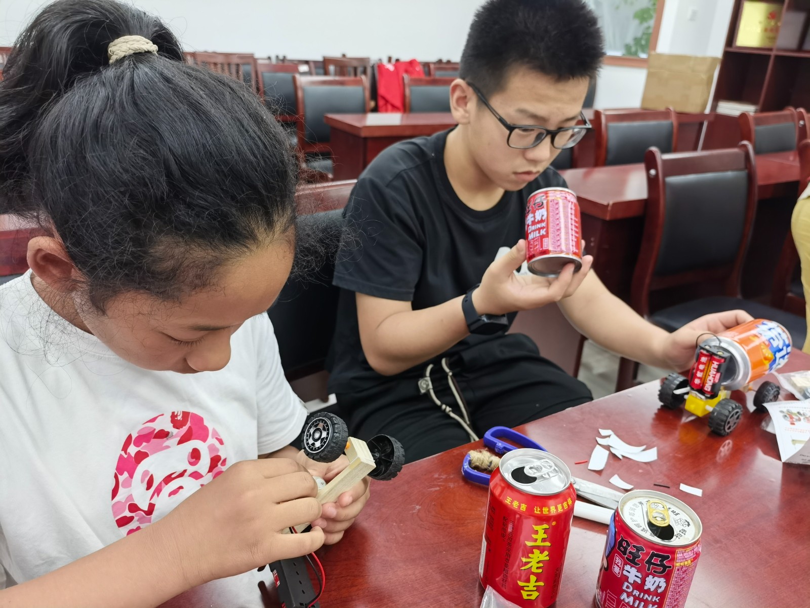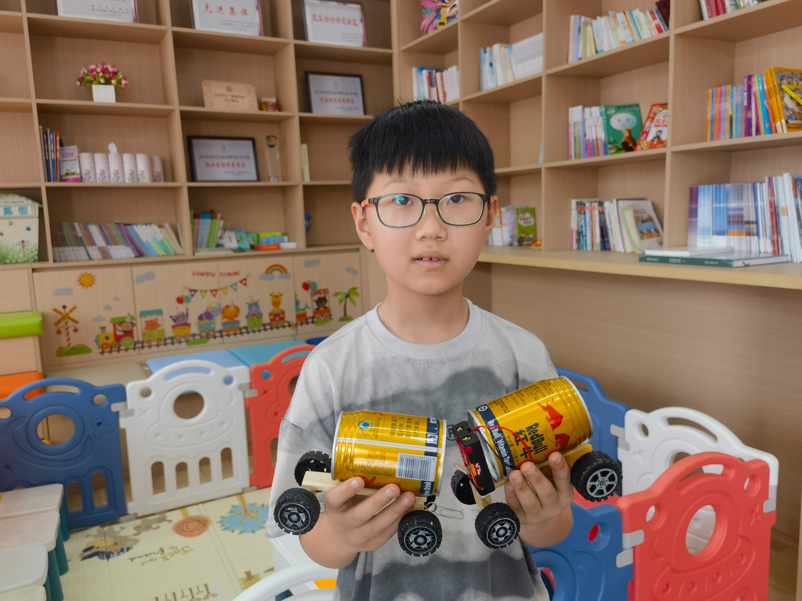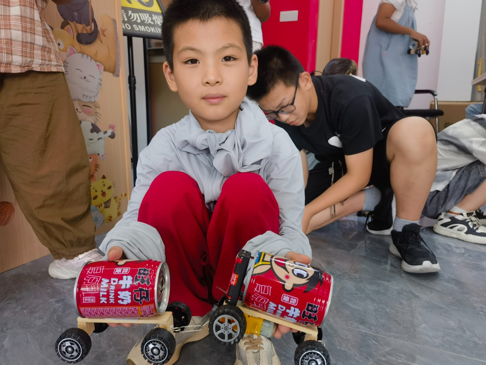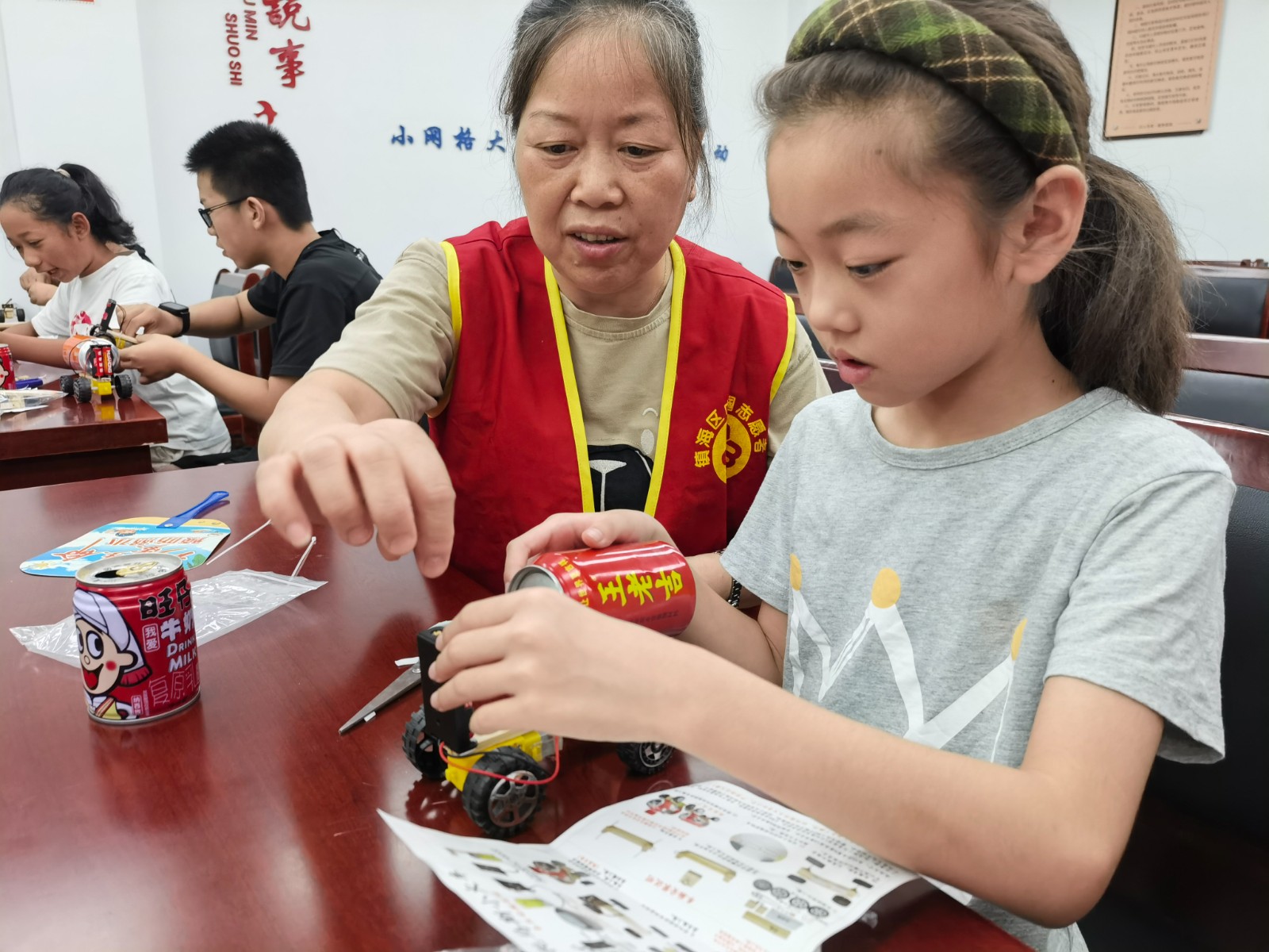 手工DIY环节,汇爱手工坊的志愿者老师们将平时收集的易拉罐、矿泉水瓶以及电池、马达等制作材料分发给每位学员,并讲解将它们合理运用组装成形的方法。同学们两人一组边听边动手,遇到不明白的地方,便互相沟通分享技巧。手工坊老师也在一旁耐心的提供指导。经过一个多小时的不懈努力,成功完成了易拉罐妙改电动小火车的制作。当孩子们看着自己亲手制作的小火车跑起来时,脸上泛起了浓浓的自豪感和成就感。