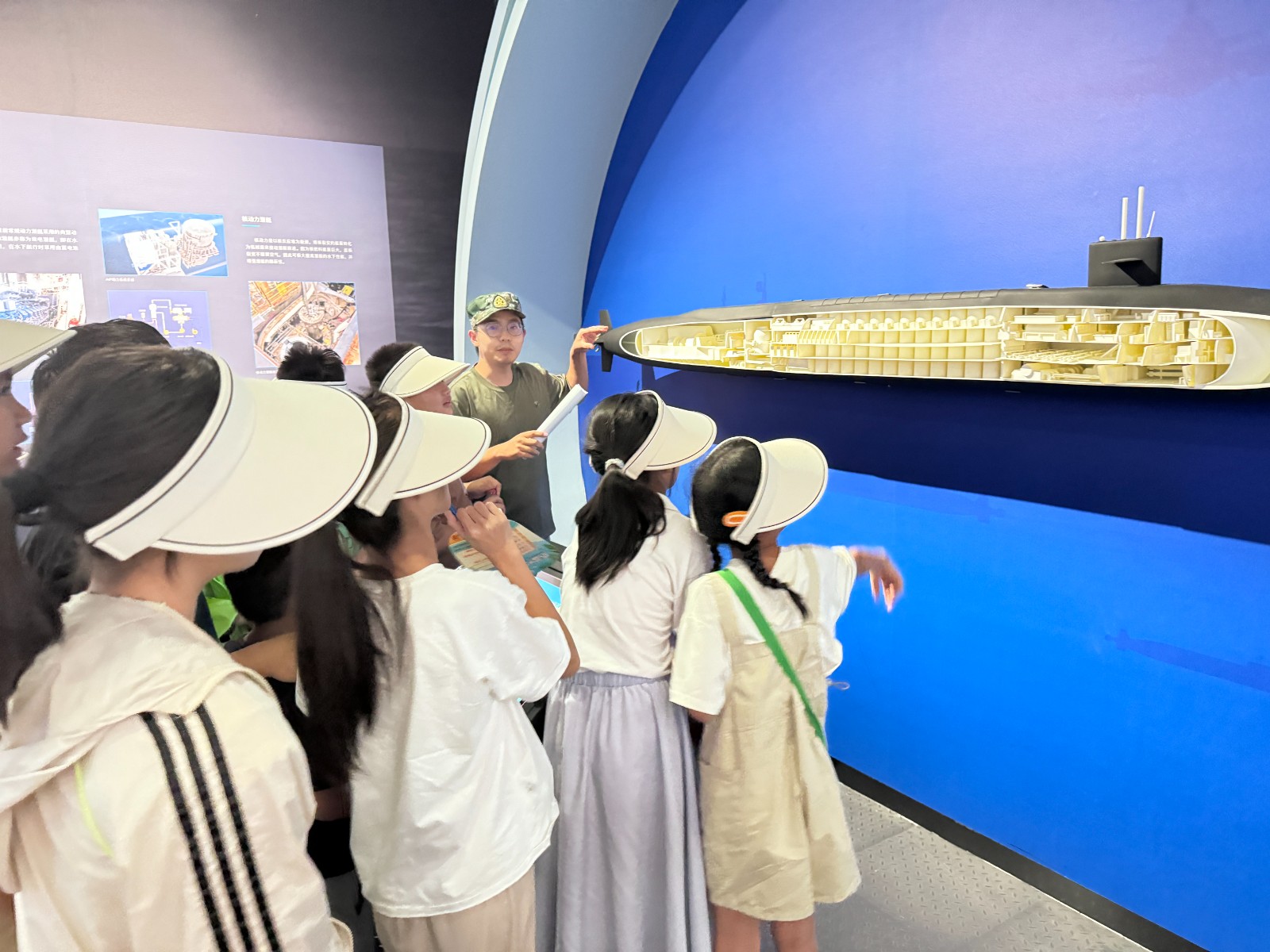 “哇,好威武啊!”初次见到潜艇,大家不由自主地发出赞叹。现场的工作人员结合物理知识为大家讲解了潜艇的浮潜原理,以及潜艇内部构造、军事意义。沿阶梯缓缓走进潜艇内部,孩子们纷纷表示闷热、空间狭窄。外形庞大的潜水艇内部空间竟是如此狭小!“这里就是潜艇官兵睡觉的地方,每张床宽度只有0.5米,翻个身就可能滚到床下去。”工作人员介绍,这艘潜艇共有7个舱,每个舱位都有特定的功能,有专门发射鱼雷的1号舱,有为潜艇提供动力的5号舱……通过工作人员深入浅出的讲解,孩子们将中国人民海军潜艇部队的风姿和中国人民直面海洋、勇于开拓的时代精神深耕于心灵。
