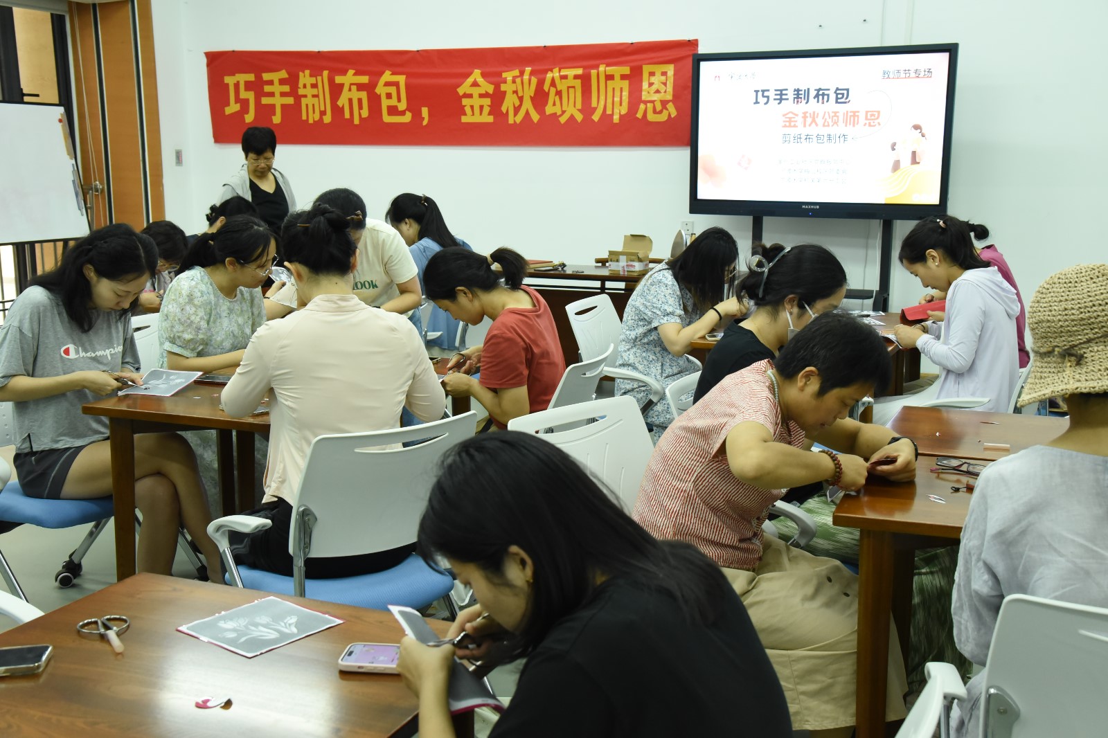 为了营造浓厚的节日氛围,感谢辖区老师们的辛苦付出,在教师节来临之际,梅山成校教学点金创工业社区党群服务中心、金创工业社区妇联、宁波大学梅山校区管委会举行教师节专场活动,将仪式感满满的课程送进宁波大学梅山校区。9月6日午间,30余名教职工齐聚梅山校区图书馆,通过制作剪纸布包的形式,为辖区教师送上最真挚的节日祝福。