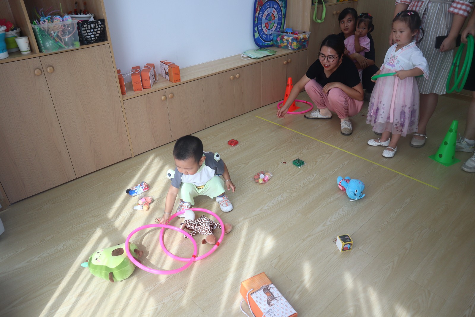玉兔套圈圈的游戏,不仅锻炼了孩子们的手眼协调能力,还让他们在游戏中体验到了成功的喜悦和失败的乐趣,学会了坚持不懈的精神。月儿圆圆,饼儿甜甜,小小的月饼承载着团圆和祝福的美好寓意。大家期待的月饼制作环节,老师为亲子家庭们详细讲解了冰皮月饼的制作过程,从材料准备到工具使用。在家长的陪伴下,幼儿们学习老师的动作,揉面团、包馅、压模……每一步都充满了探索的乐趣。
