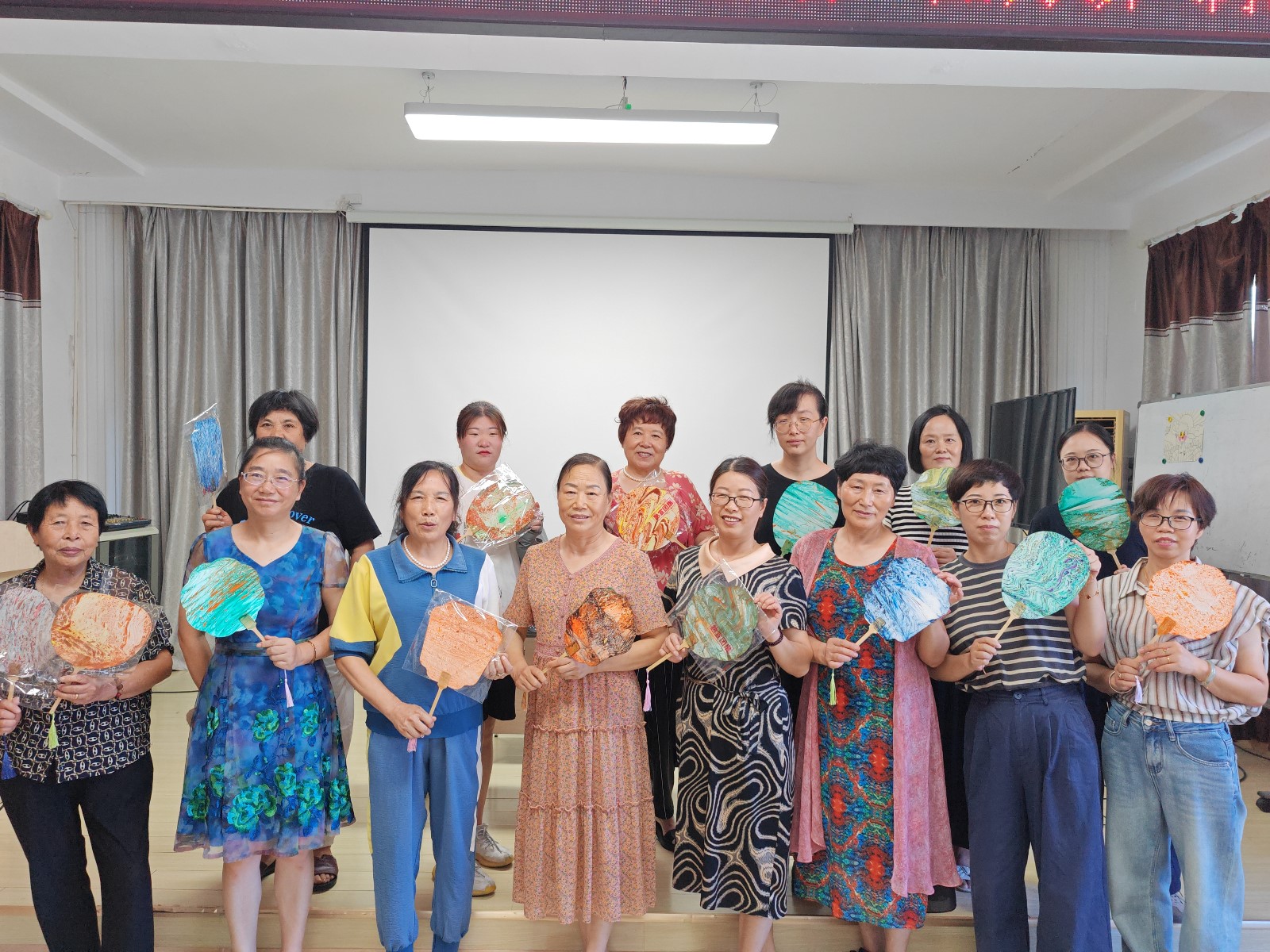 活动现场,老师首先向大家介绍了漆扇的历史渊源、文化内涵以及制作工艺,并示范了制作漆扇的过程。示范结束后,想要制作漆扇的居民们迫不及待地开始选漆、调漆,彩漆漂浮在水面上,将扇子慢慢放入水中,大漆就会随着水流附着于团扇,水因势而走的痕迹保留了下来,色彩交错随机而成,尽显诗情画意之感,精致演绎了中国传统美学。制作完成后,居民们彼此分享了对漆扇的理解和感悟,在沟通中增进了友谊。
