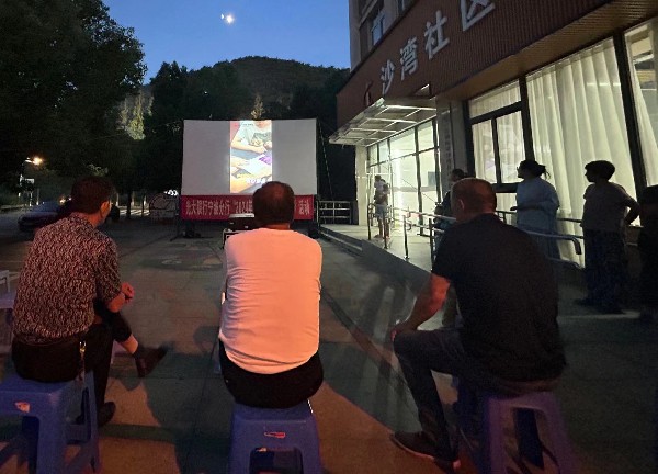 活动伊始,社工协同银行工作人员一同对现场的居民进行反诈宣传,通过发放宣传单、面对面讲解等方式向大家普及近期高发的电信诈骗类型和手段,引导群众提高防诈骗意识。紧接着,活动现场播放了一段由银行工作人员精心改编的反诈宣传快闪视频。视频以轻快活泼的节奏吸引了众多居民的目光,欢快的音乐和生动的画面瞬间将人们的注意力聚焦在银幕前。“这种学反诈知识的方式很新颖,歌词朗朗上口,容易记住!”“这样的宣传方式让人印象深刻多了!”居民们纷纷坐下,一边观看反诈视频,一边与周围邻居讨论视频中的诈骗案例。快闪视频“热场”后,熟悉的国产电影开头就映入眼帘,瞬间把在座的居民带回到小时候看露天电影的场景。“记得上次看露天电影还是在初中,没想到现在都有孩子了。虽然《孤注一掷》看过很多遍,但和邻居一起看,氛围就是不一样。”居住在东城华园的拆迁居民乐小姐表示。