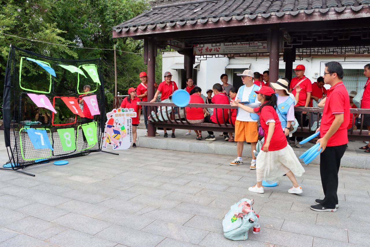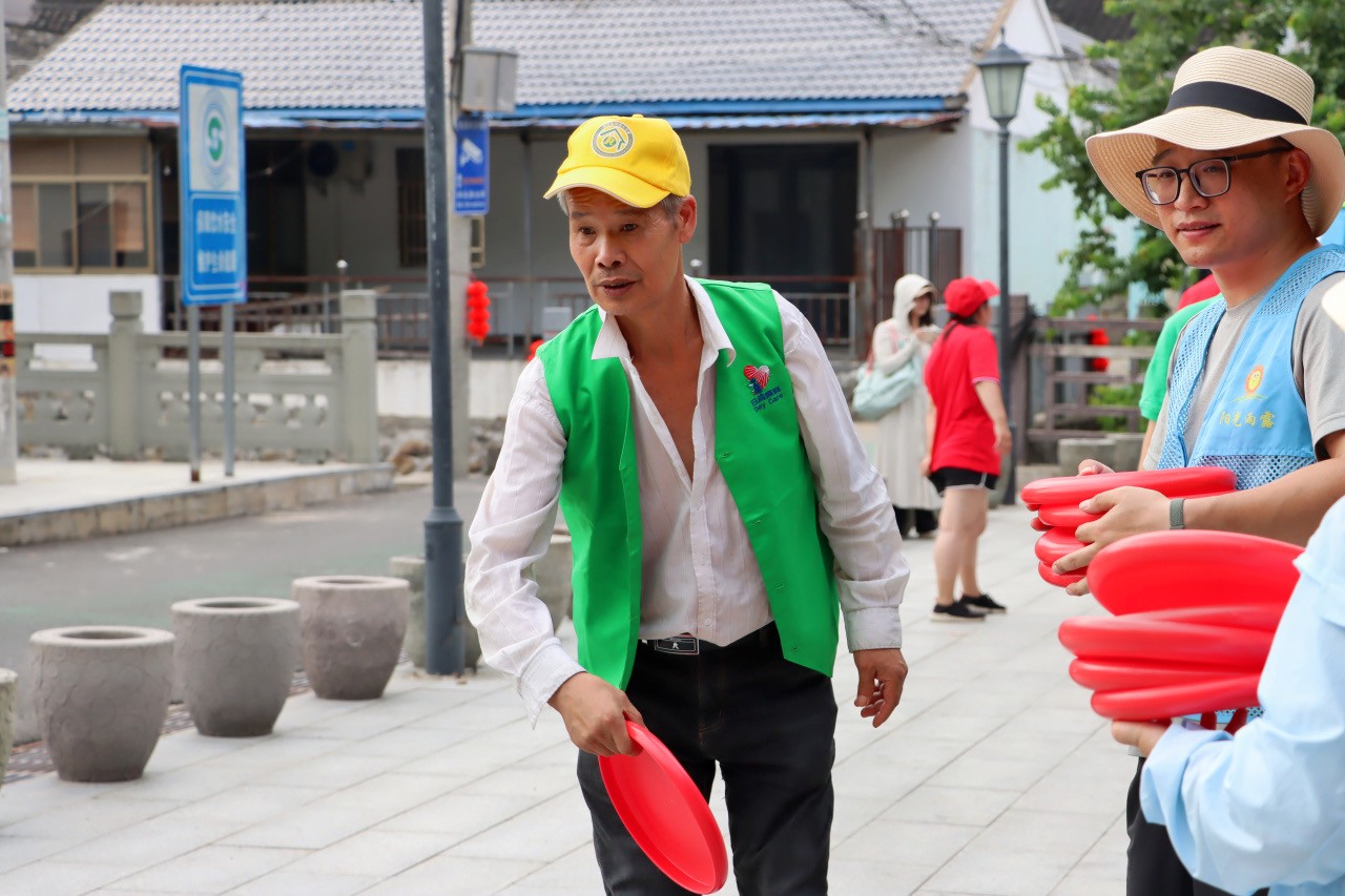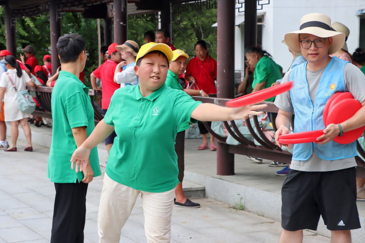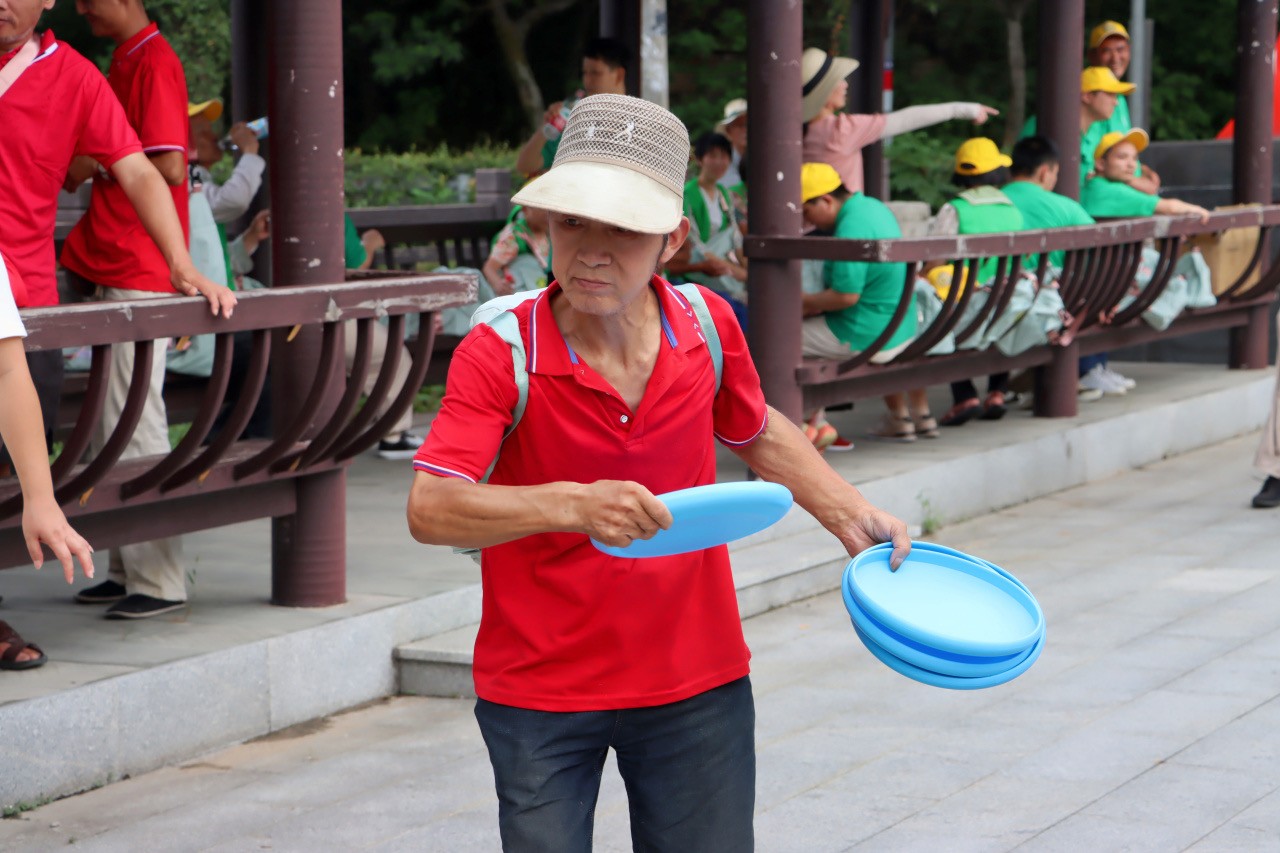 队伍抵达游客服务中心时,一场趣味横生的飞盘九宫格游戏也开始了,50名残疾人摩拳擦掌,热情高涨,站在规定距离外,全神贯注瞄准九宫格,依次投掷飞盘,尝试击中九宫格中的分数板块,最后累加得分角逐出个人一、二、三等奖。每一滴汗水,每一个动作,都传递着他们对体育竞技的热爱。
