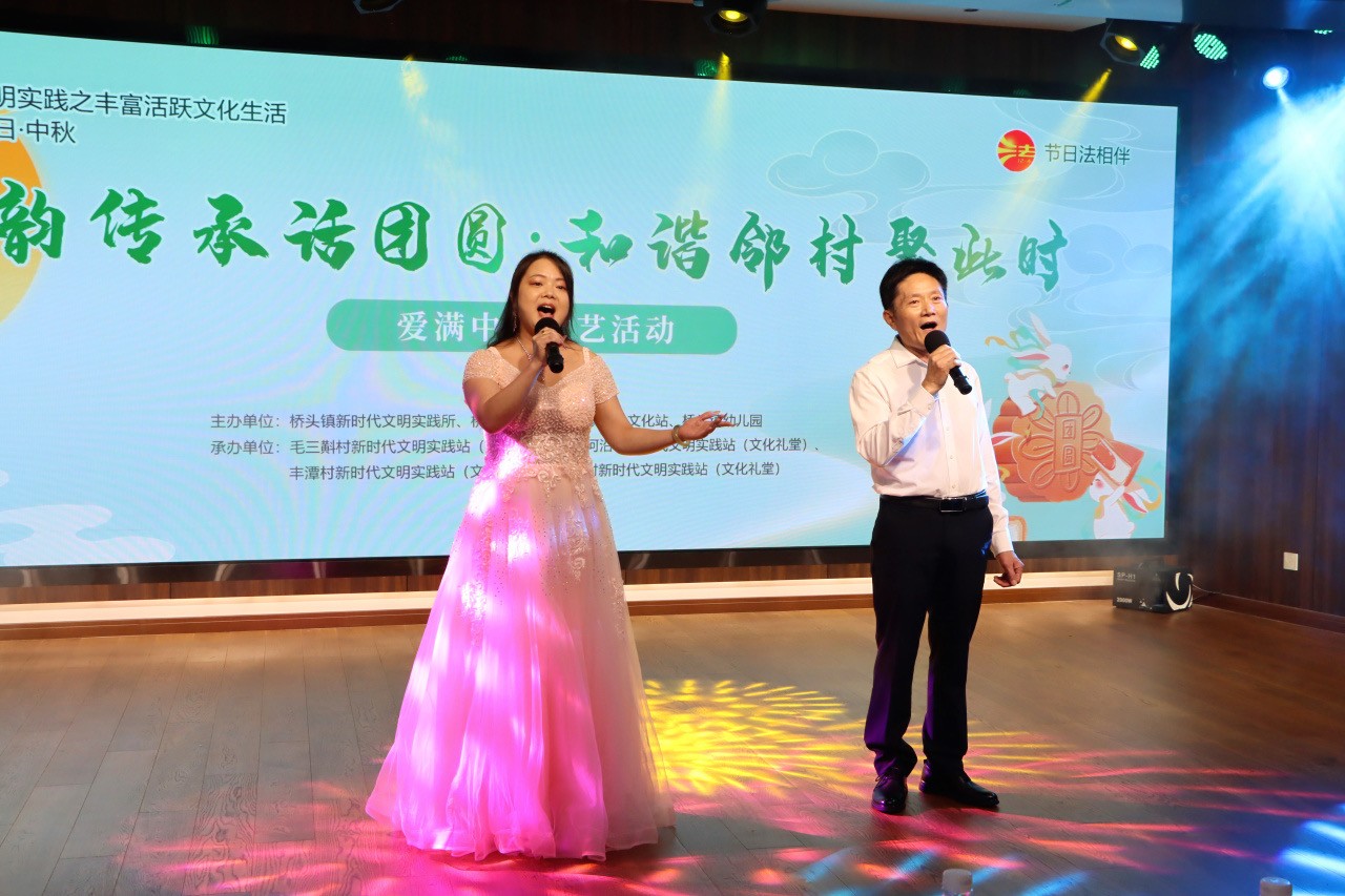 为丰富村民们的精神文化生活,促进了各村之间的文化交流与合作,在镇新时代文明实践所、桥头成校指导下毛三斢村、潭河沿村、丰潭村、五丰村四村联合举办“古韵传承话团圆 和谐邻村聚此时——爱满中秋文艺活动”,营造了温馨和谐节日氛围。越剧、舞蹈、独唱、二胡演奏等十余个形式多样、风格多变的节目逐一登场,赢得了现场观众阵阵掌声。