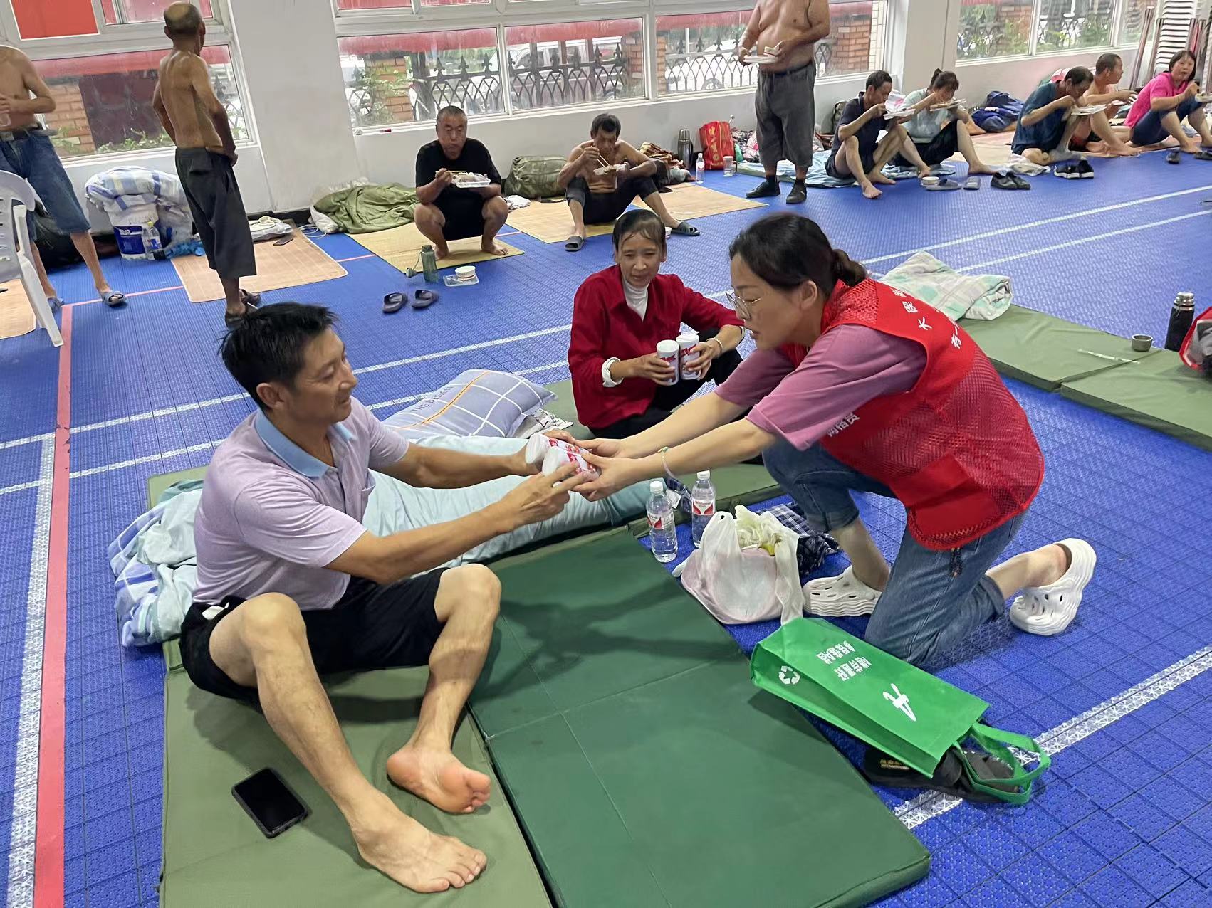 “方便面泡好了,小心烫,慢点吃。”“这是八宝粥晚上肚子饿的时候可以吃。”“盒饭还合胃口吗?”在大碶小学避灾点,社区网格员正有条不絮地给安置工人们分发食物。
