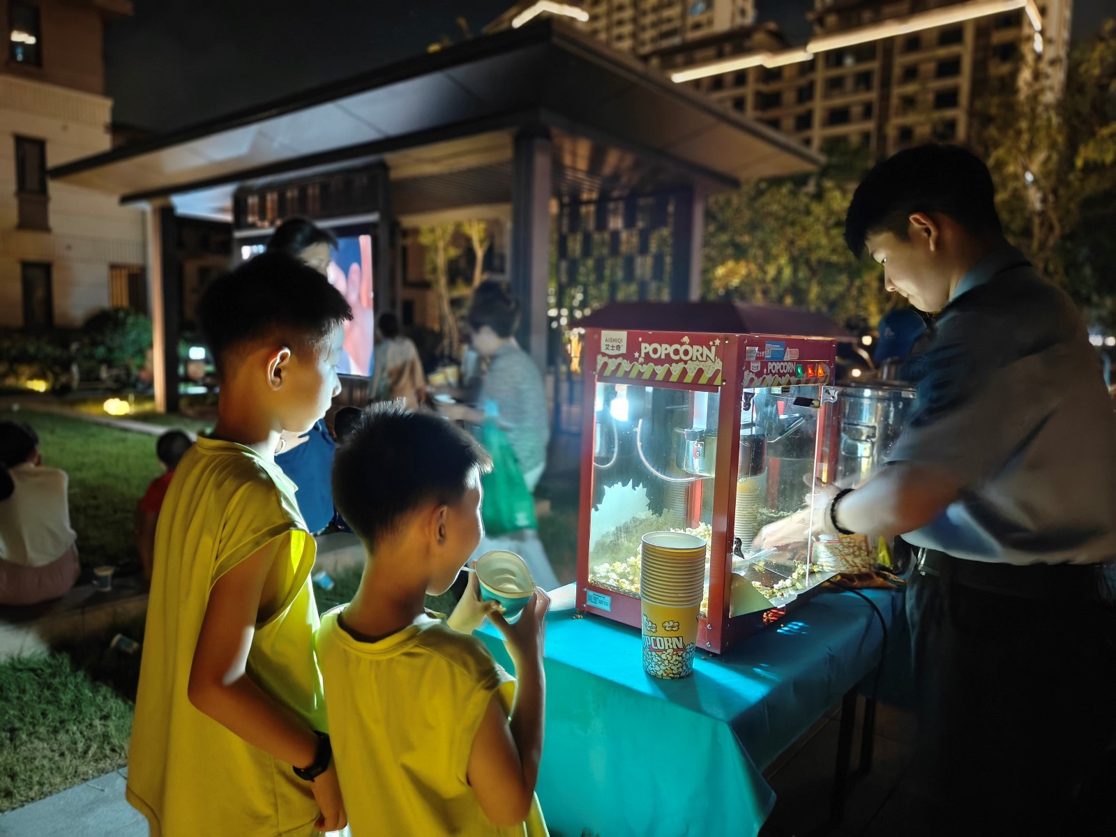 经过连续两个台风的“光顾”,九月的气温瞬间凉爽了许多,大家带着小板凳,或三五成群,或全家出动,齐聚一堂。现场充满了欢声笑语,孩子们兴奋地奔跑嬉戏,大人们则轻松地交谈着,构成了一幅和谐美好的社区画卷。除此之外,现场还有网格员、物业工作人员贴心地为居民及小朋友们发放小扇子、爆米花、烤香肠等,让居民能够边享受清凉及美食的同时投入地观看影片。观影的小朋友们开心地说:“电影太好看了,真的太有意思啦!”居民们也纷纷表示,社区和物业让他们在家门口感受儿时观影的快乐,希望以后能够多举办这样的活动。