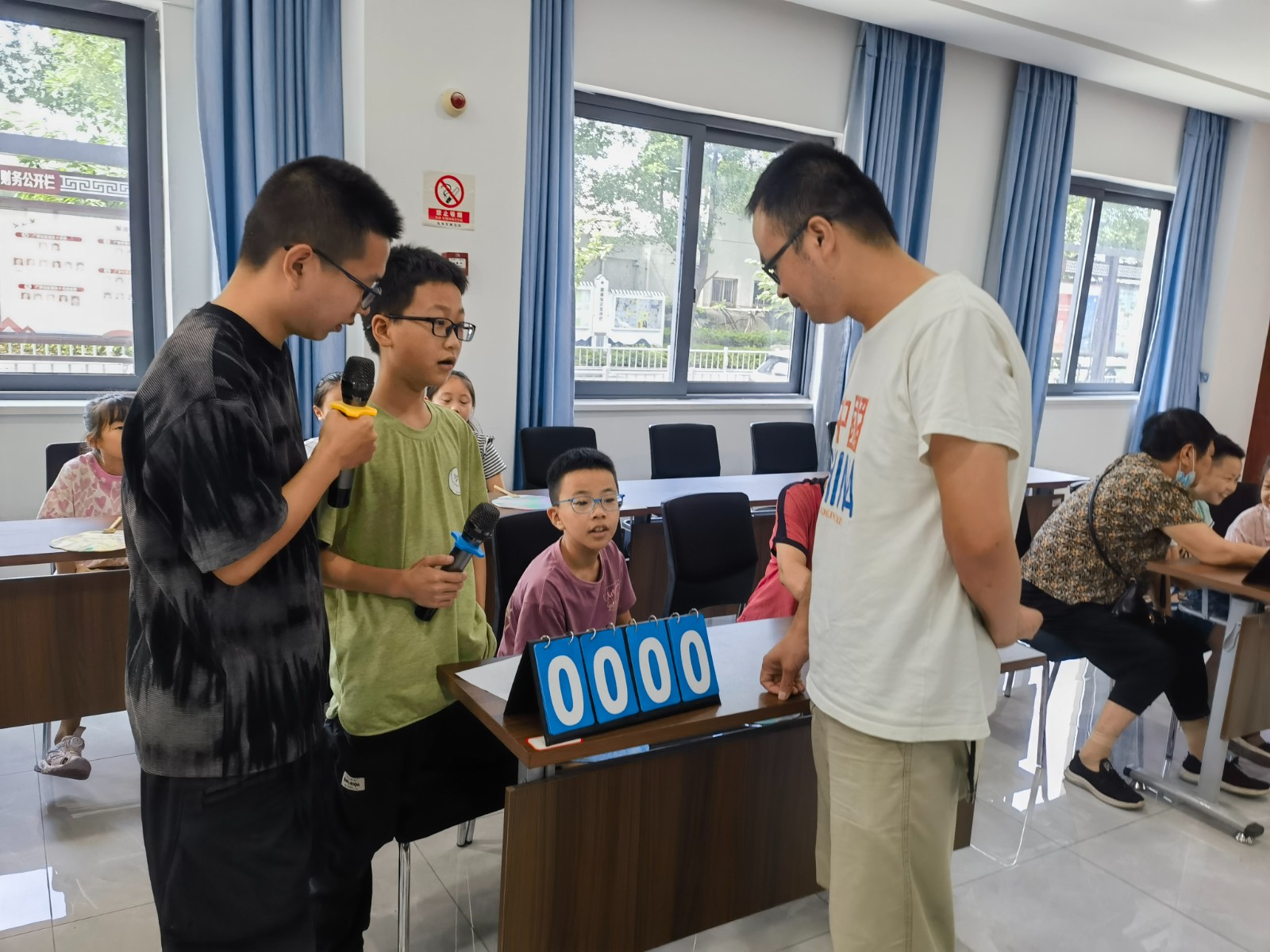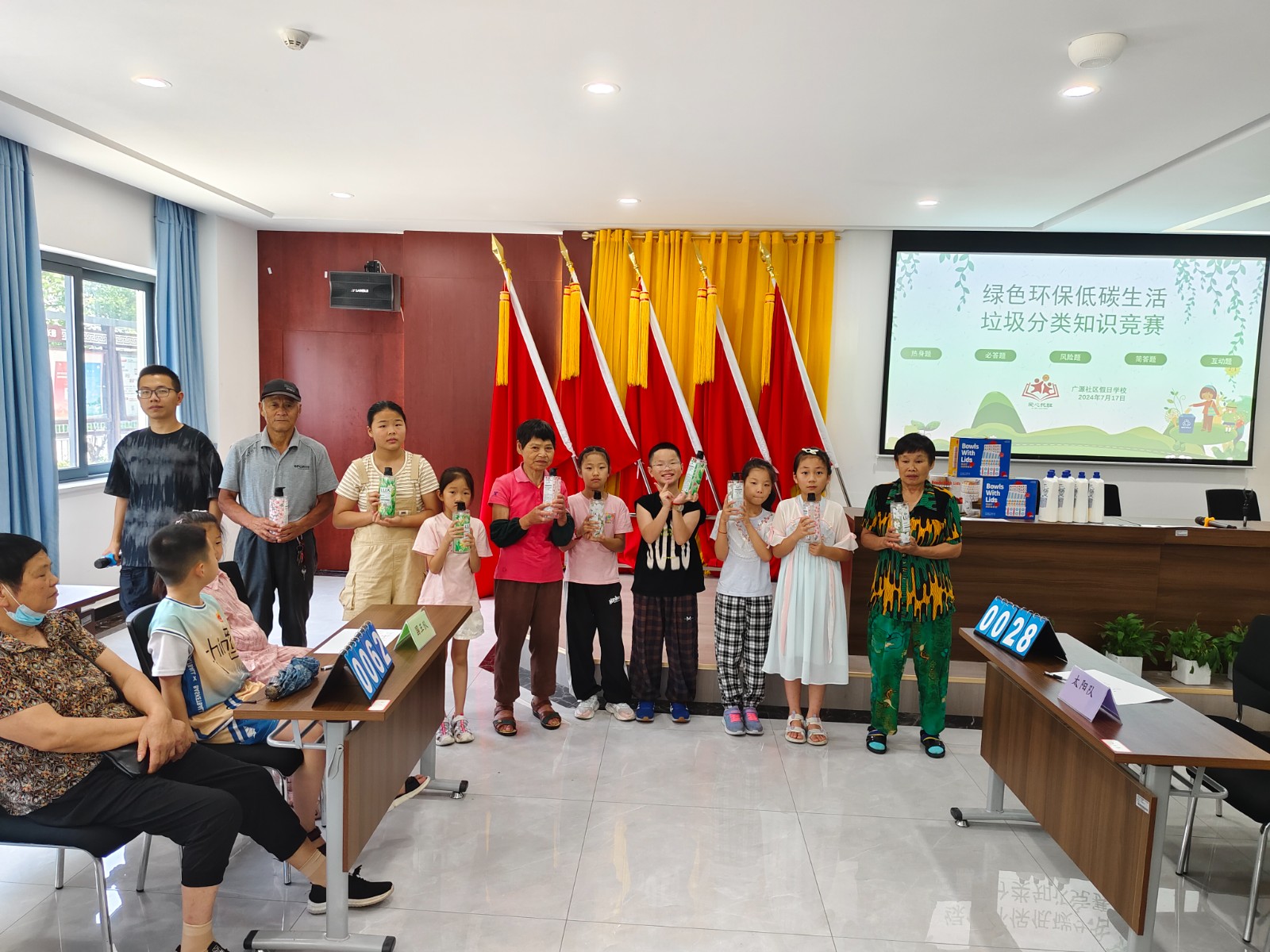 由生活垃圾桶边督导员和青少年垃圾分类志愿者组建的6支队伍在广源社区党群服务中心进行着一场激烈的垃圾分类知识比赛。
