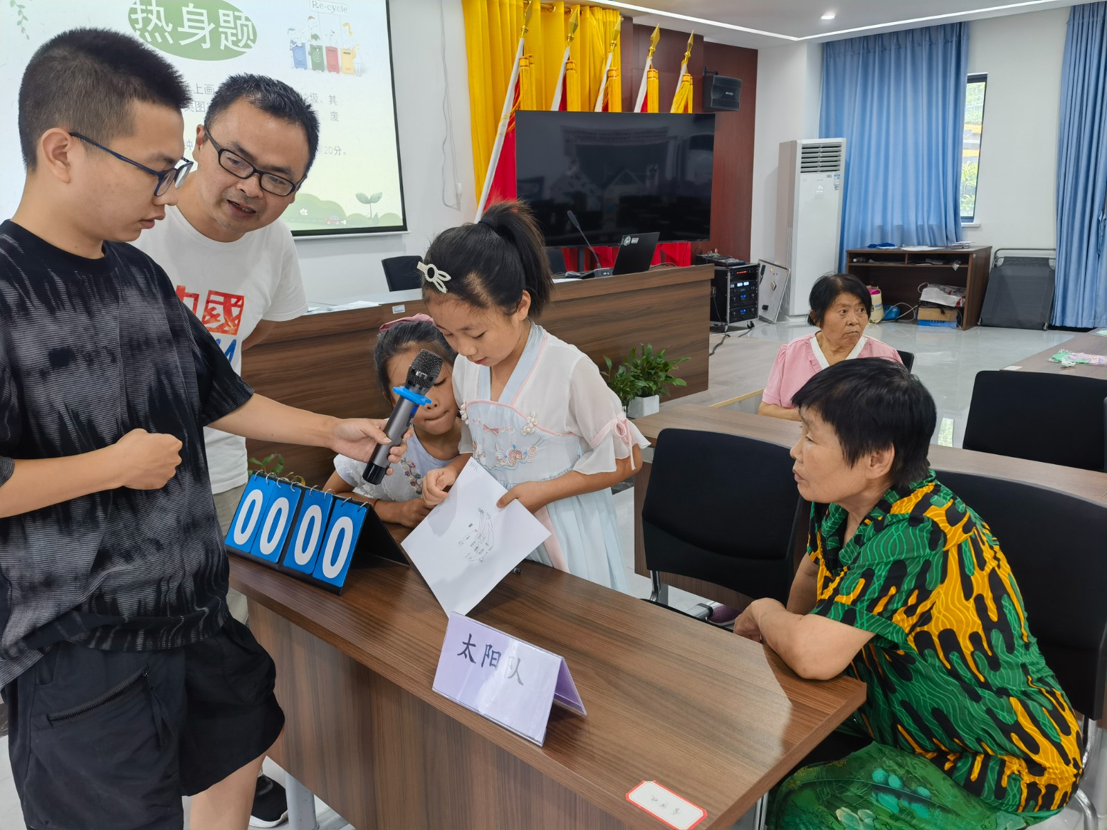 开局第一场比赛挑战难度就很高,不但要把生活中四类垃圾分别用画笔在纸上画出,并进行正确分类。青少年志愿者画图,督导员们进行分类,一幅幅画风各异,但分类准确的示意图展示在大家眼前。接下来是必答题、抢答题,各队选手争先恐后,使出了平时督导和宣传员的知识,分数一直不分上下。最后一场的场景题,通过视频中找错误点,将知识在生活实际中进行了应用,最终由校院新村队获得了第一名。