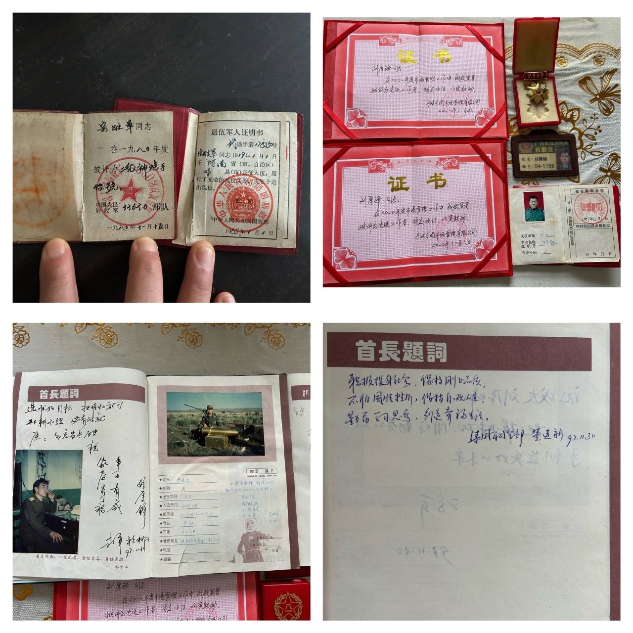 在老兵刘厚锋家中,一摞奖状和2本军人纪念册引起了大家的注意。“积极投身社会,保持刚正品质;不怕困难挫折,保持乐观人生;勤奋学习思考,创造幸福生活。”“选准好目标,把握好方向,勤耕不辍,必有成就”......醒目的首长题词是他人生路上的指路灯,他一直视如珍宝,多年来他活跃在各种志愿队伍中,不管是台风天冲锋在前,还是在安全隐患巡查、普法宣传、志愿服务等方面他都身先士卒,体现了一名退伍老兵的责任感和奉献精神。