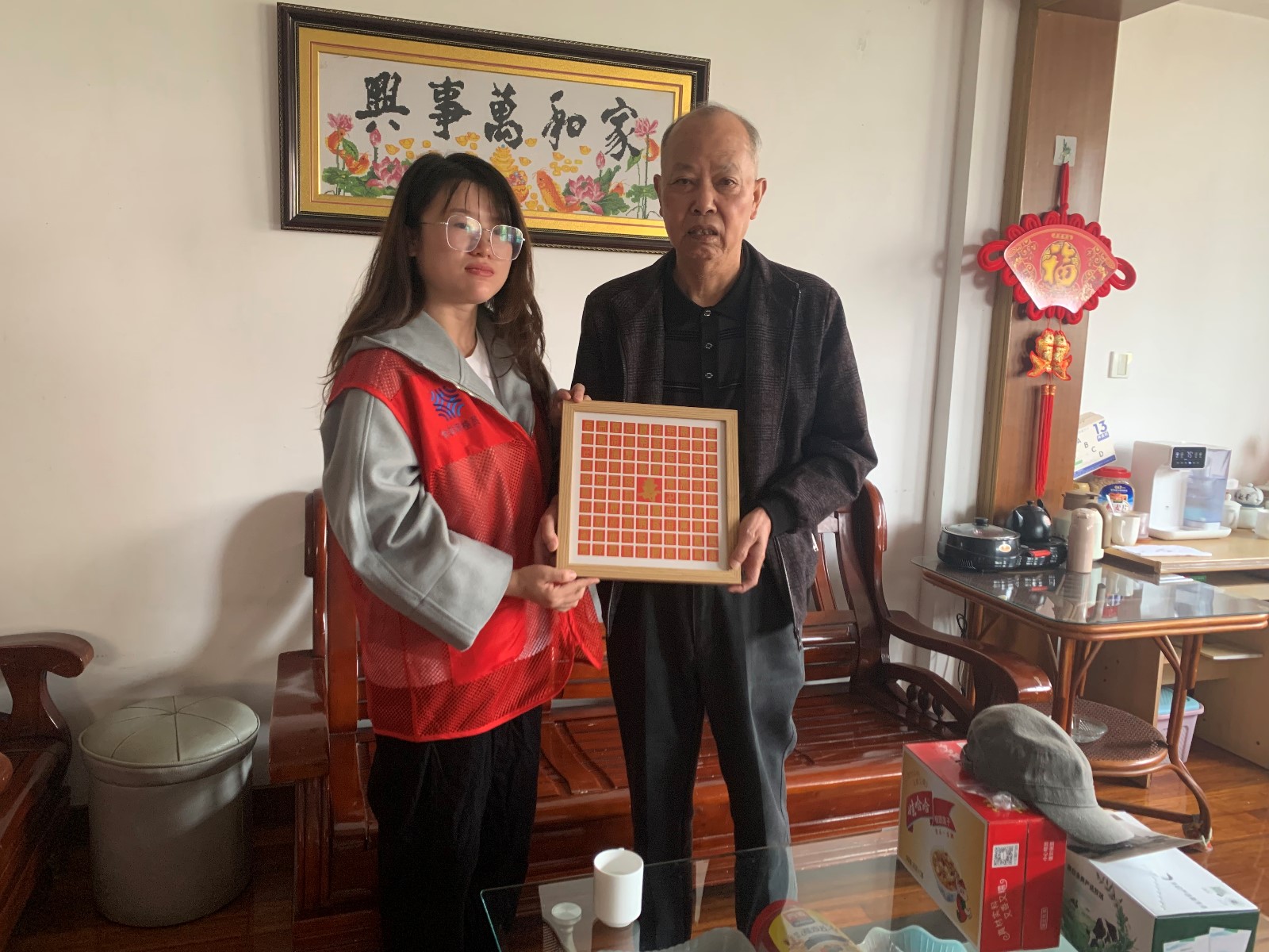 重阳节至,一早,网格员带着这份亲手制作的百寿图来到辖区高龄老人的家中,这不仅是一份礼物,更是一份传承,让尊老敬老的传统美德在家族中代代相传。在上门过程中,网格员还主动为老人讲解医保政策、反诈小知识,了解老人的实际需求,并暖心地叮嘱老人及时增添衣物,如果有需要,及时拨打网格员电话。