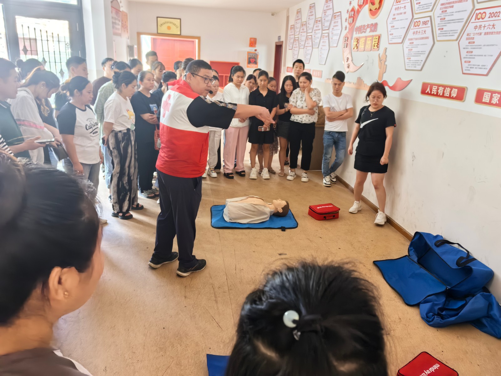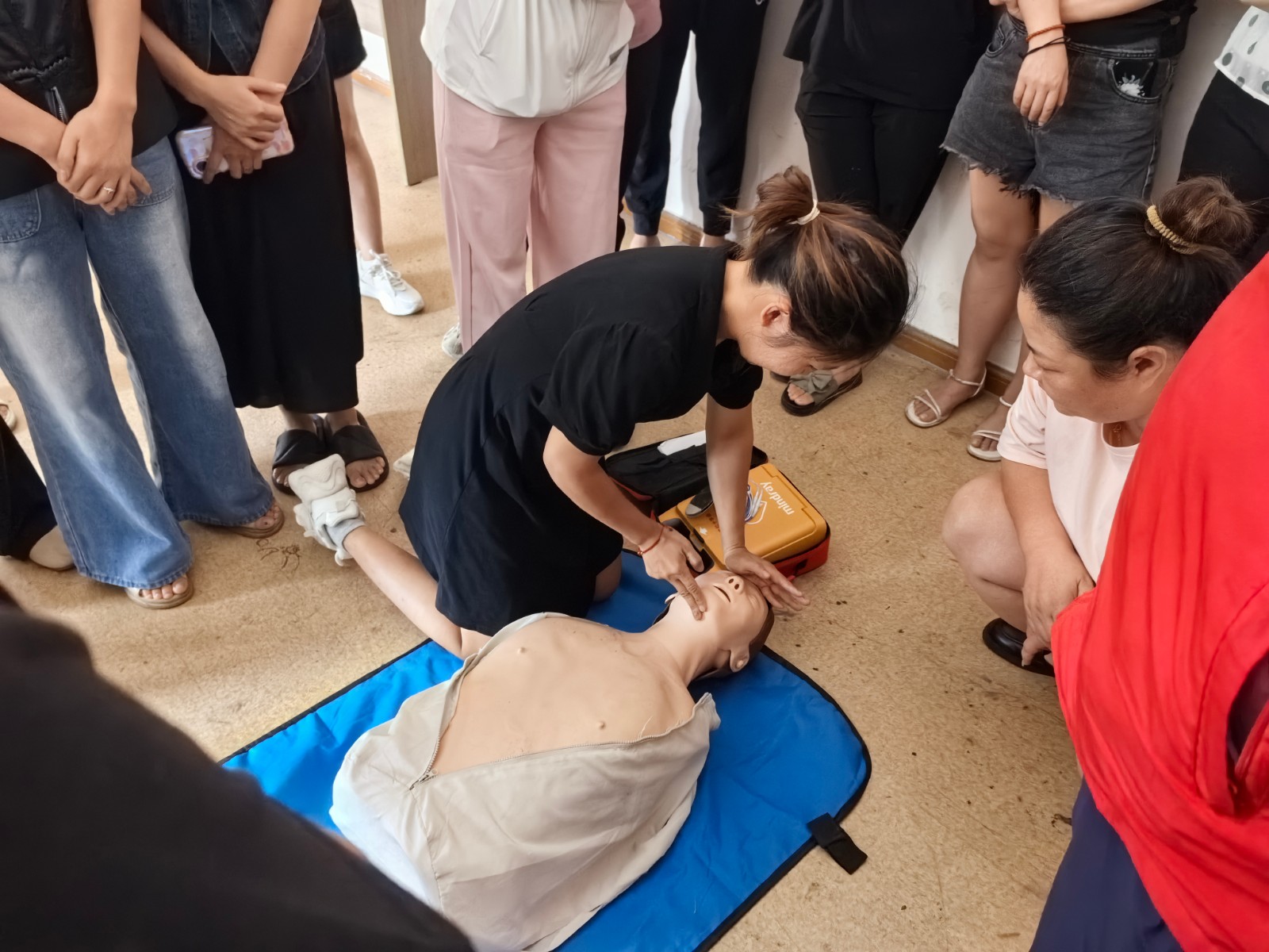 来自红十字会的老师们以理论讲授、现场演示、实践操作相结合的方式为学员们进行讲解培训,通过多媒体、展示实物、现场演示等方式,强调应急救护黄金四分钟的重要性。心肺复苏配合AED的使用,是本次培训实操的考核部分。通过老师现场的操作演示,让在座的全体学员了解了正确实施急救的方法。