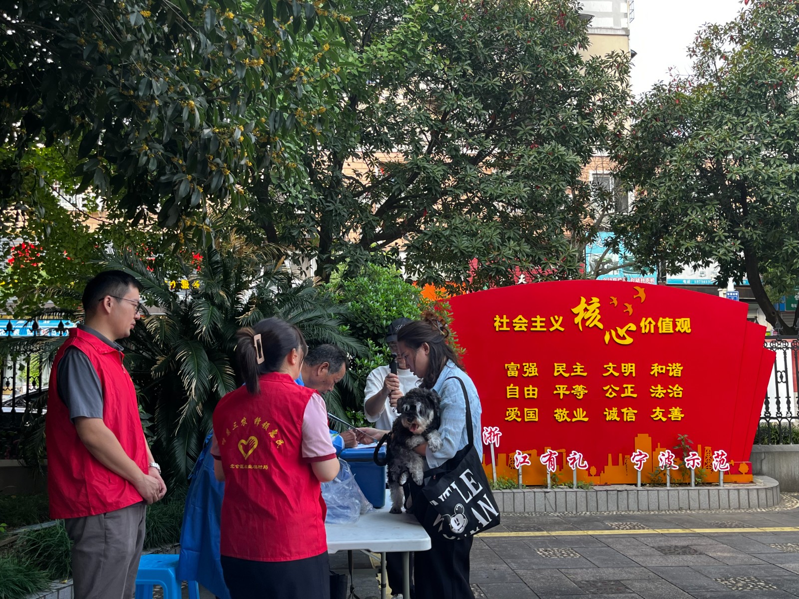 活动前期,社区网格员利用“一格两群”、小区公示栏对接种疫苗的时间和地点进行广泛宣传。活动当天,社区工作人员与志愿者们早早地搭起了服务台,准备好了疫苗、注射器材以及各类宣传资料。为了营造一个温馨、有序的环境,现场还设置了宠物等待区、疫苗接种区以及咨询解答区,确保每位前来参与的居民都能得到专业、周到的服务。上午8时整,不少居民牵着自家的宠物犬,有序地排起了长队。防疫人员在疫苗接种区忙碌而有序地进行着疫苗接种工作,每完成一只犬的接种,都会耐心地向宠物主人讲解接种后的注意事项,确保接种效果最大化。同时,志愿者们也不忘向居民发放文明养犬手册,普及狂犬病预防知识,倡导社区居民文明养犬,共同维护社区公共卫生环境。