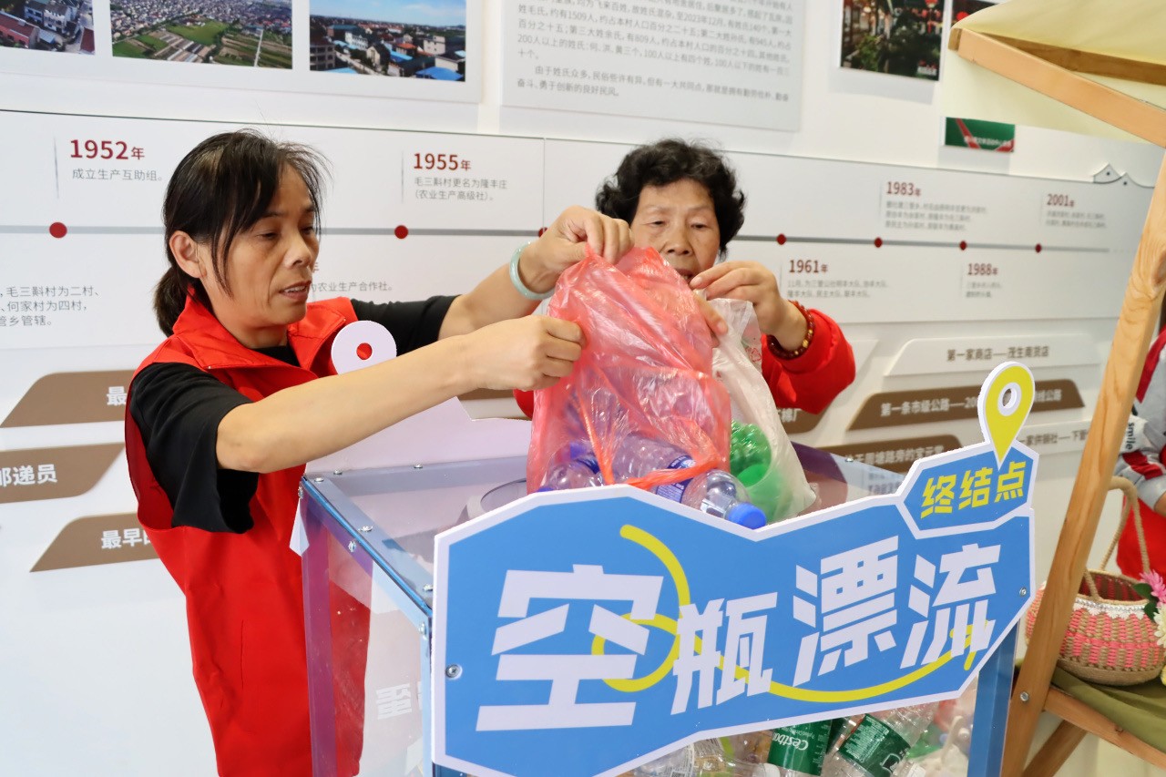 毛三斢村德兴苑设立“空瓶漂流”兑换点,鼓励村民将家中闲置的空瓶带来集中回收。活动现场,村民们纷纷提着大包小包的空塑料瓶兑换鸡蛋,在提高村民满足感的同时又进一步加强他们的环保意识。