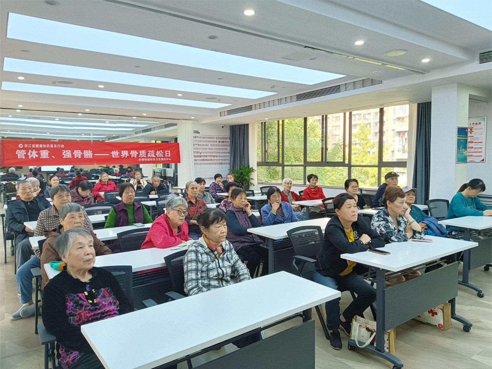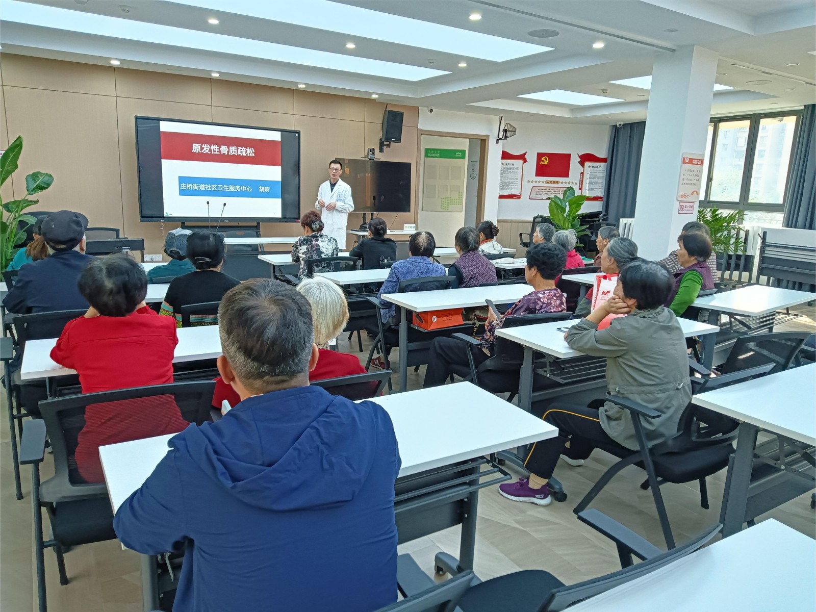 为了进一步增强老年人的健康意识,提高他们对骨质疏松的认识和预防能力,关爱社区老年人,2024 年 10 月 22 日上午,庄桥街道天沁社区特地邀请了庄桥卫生院的全科医生胡医生来社区邻里中心三楼幸福学堂为社区老党员开展一场《骨质疏松》健康讲座。