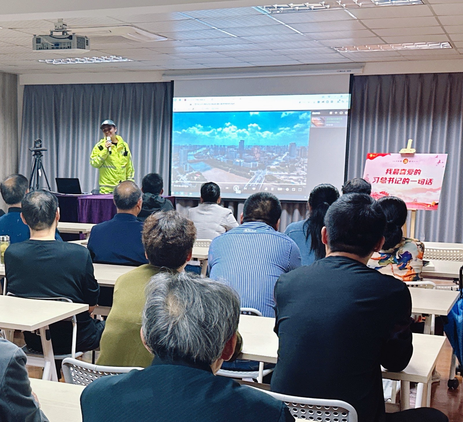 宣讲在交通安全警示片的播放中拉开帷幕,片中一幕幕因未戴头盔、闯红灯、超载等电动车常见交通违法行为所导致的交通事故画面以及一个个触目惊心的碰撞瞬间,给在场居民带来了强烈的视觉冲击力。