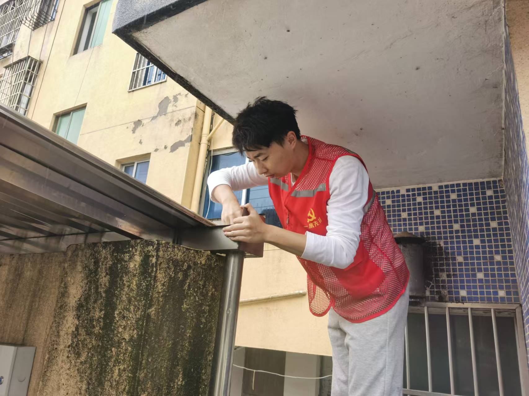 “安泰路15弄2号路前充电桩排水管堵塞了,雨水直接从墙壁上渗流下来......”电力抢修完毕后,峰城社区网格员、微网格长继续在风雨中加强辖区巡查力度,发现峰城西区充电桩处存在隐患,立马利用盘梯爬上顶棚,及时将树叶和杂物进行清理,保证排水口通畅。