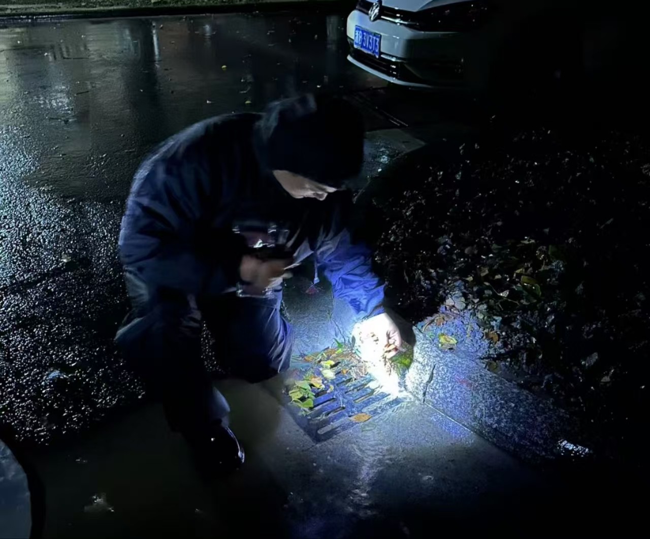 育才小区停车场积水了1031夜晚宁波市镇海区蛟川街道未名社区巡查时,社区网格员发现了辖区时。巡查小队上门查看停车场实际情况,发现积水严重立刻排查附件积水点,清理堵住窨井盖的垃圾。