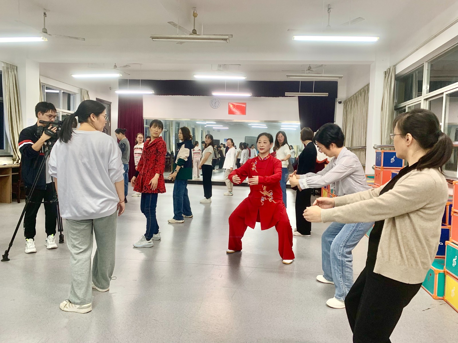 八段锦作为传统健身瑰宝,备受青睐,满额成班。“膝盖不能过脚尖”、“两个拇指抵住”、“肘部下沉”……通过集体练习、分组指导、单独指点,专业教师耐心纠正了学员在自行练习中常出现的各种问题,学员准确的招式中感受身心的舒展,领略传统健身文化的深邃魅力