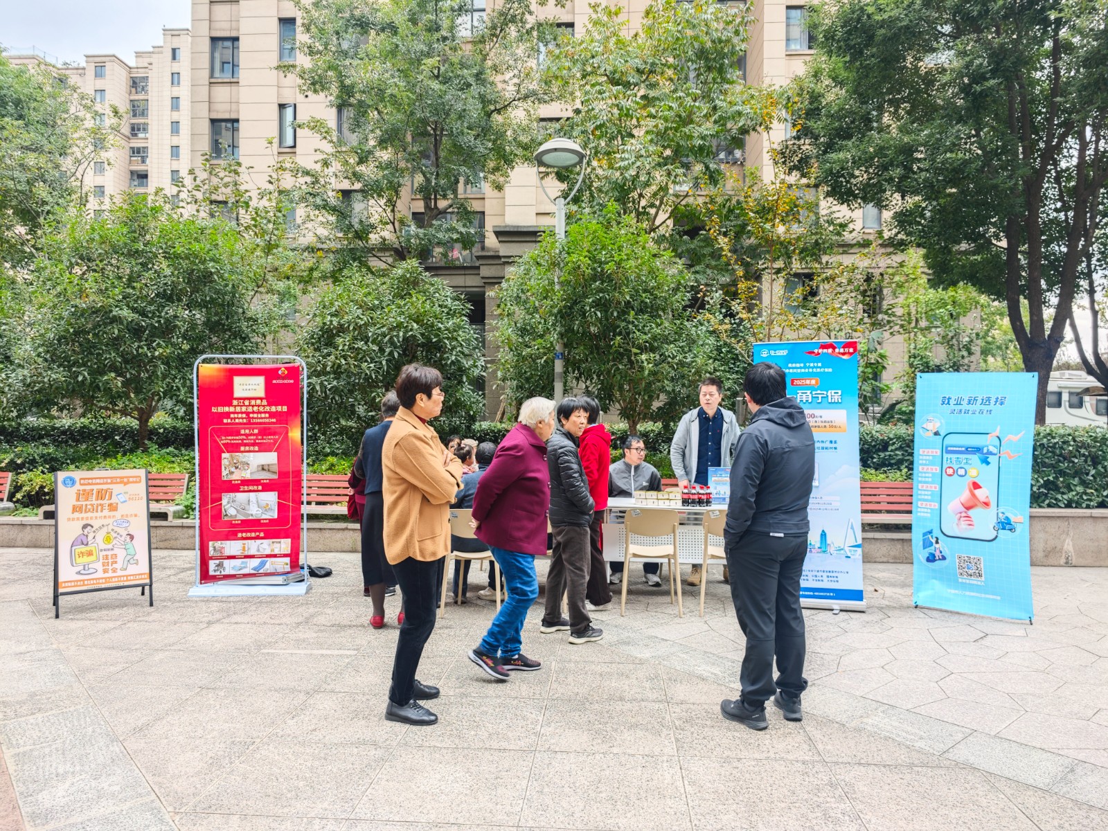 集市现场,一改从前“人找服务”模式,工作人员化身热情摊主招呼着过路的居民,详细讲解各类服务,耐心解答他们关于各项政策的疑问。并通过互动问答、发放宣传册、展板展示、现场演示等方式,让居民们对如何防范网络诈骗、家庭消防安全知识、甬宁保的覆盖范围、适老化改造的具体措施以及就业帮扶的途径等都有了更深入的了解。整场活动共接待咨询居民六十余人,发放宣传资料一百余份。