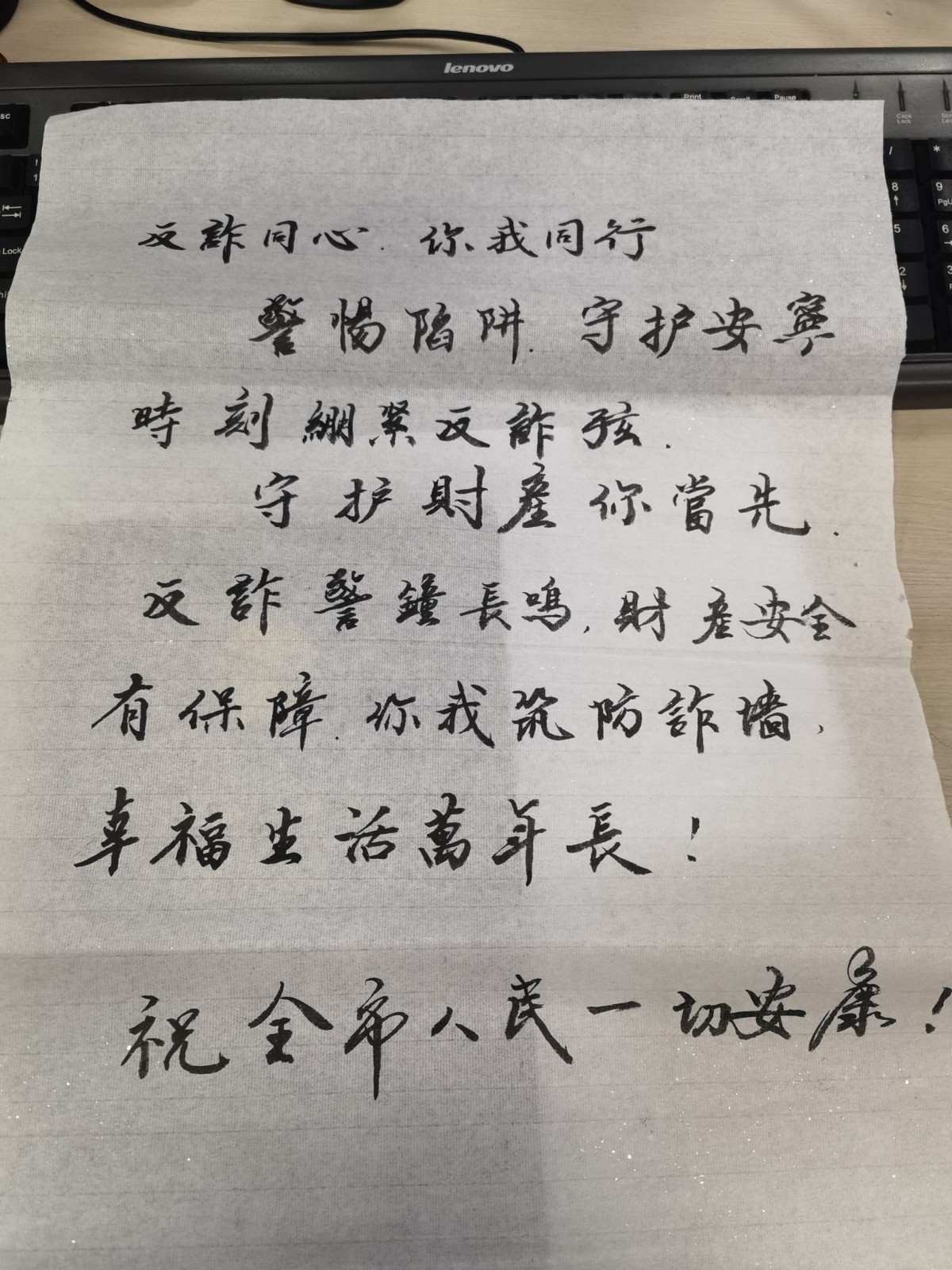 这些反诈标语被张贴在社区的公告栏、宣传栏以及人流密集的公共场所,吸引了众多居民驻足观看。不少居民表示,这些书法作品不仅美观大方,更让他们深刻认识到了诈骗的危害性和防范的重要性。同时,他们也纷纷表示将积极参与到反诈宣传中来,共同维护社区的和谐稳定。