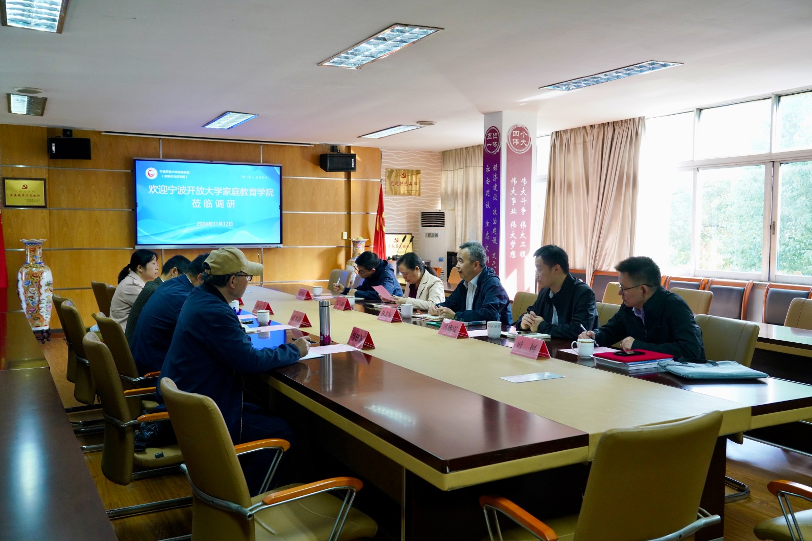 1112日,宁波开放大学家庭教育学院院长林志标、资源中心主任冯姚震、五级职员纪立新等领导一行来到宁波开放大学余姚学院,对家庭教育工作展开调研,并就家校协同育人资源开发项目进行洽谈。余姚学院院长沃其洪、副院长徐文吉、培训处主任叶海艳负责接待工作。