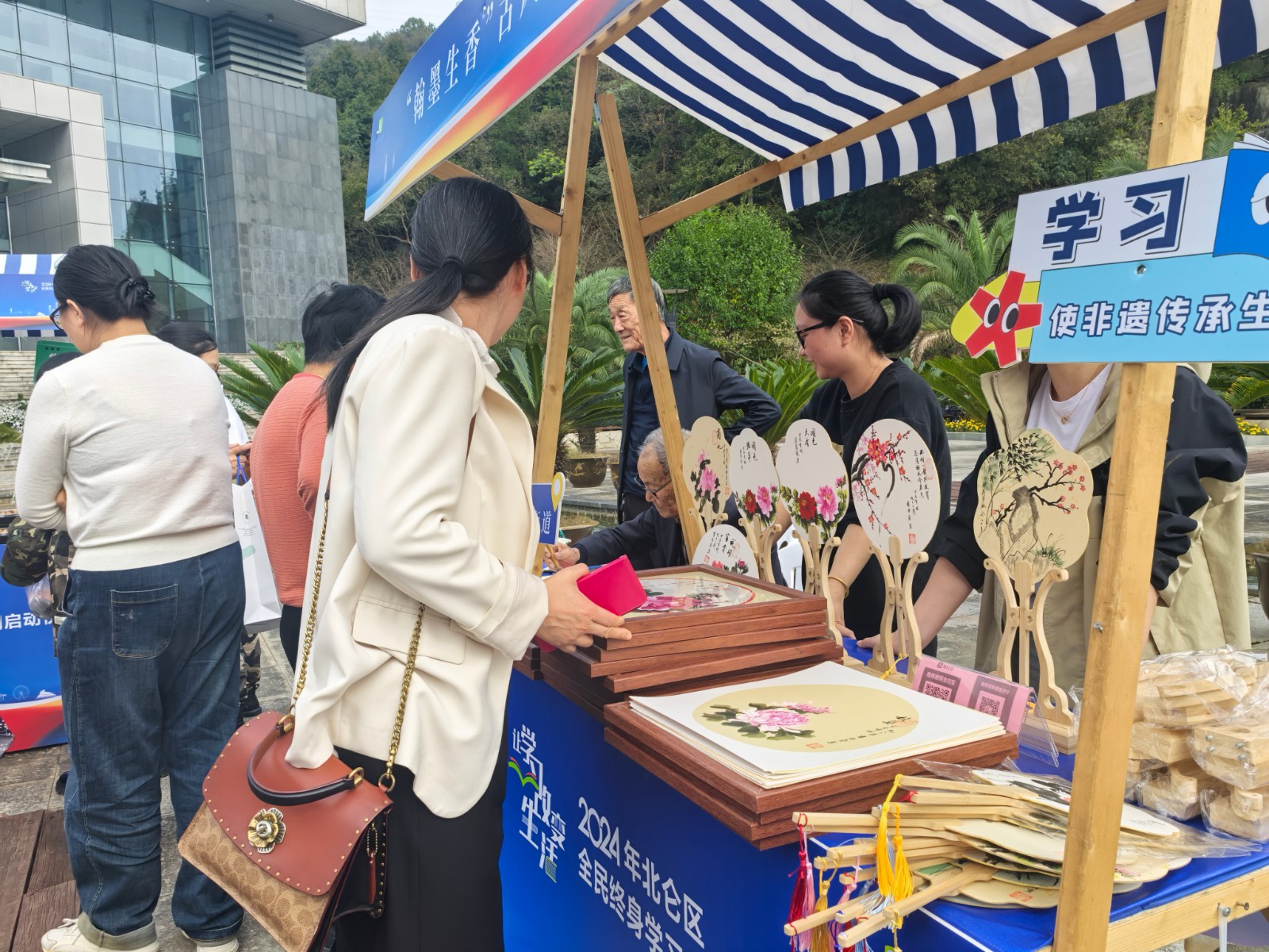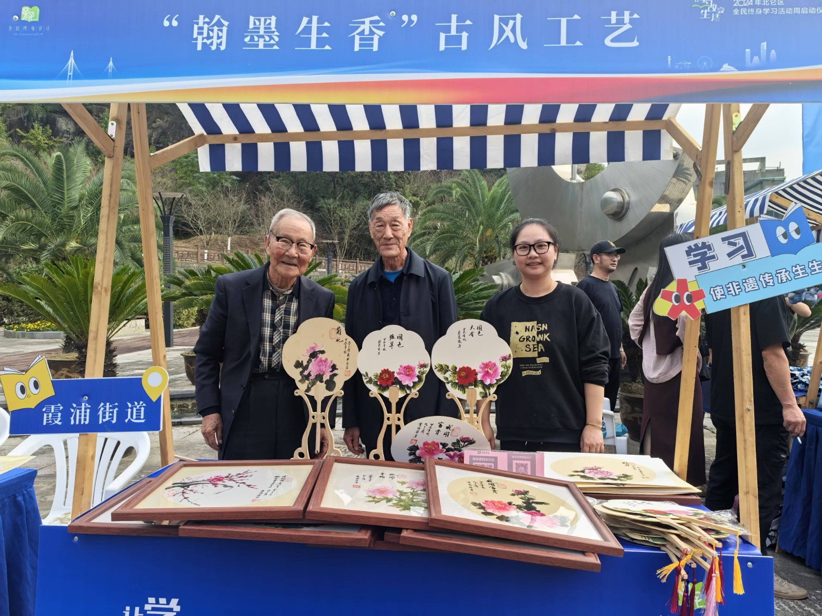 一幅幅精致的牡丹、一把把精美扇子.....古风工艺品和现场作画在大榭剧院举办的2024年北仑区全民终身学习活动周启动之终身教育特色项目展台上展示。这是霞浦街道老年书画班代表霞浦街道参加的终身教育特色项目展示。展台前,观赏、购买的人络绎不绝,有一位老师一下子就购买了3幅。据统计,3小时左右,共销售20余件工艺品,收入近400元。