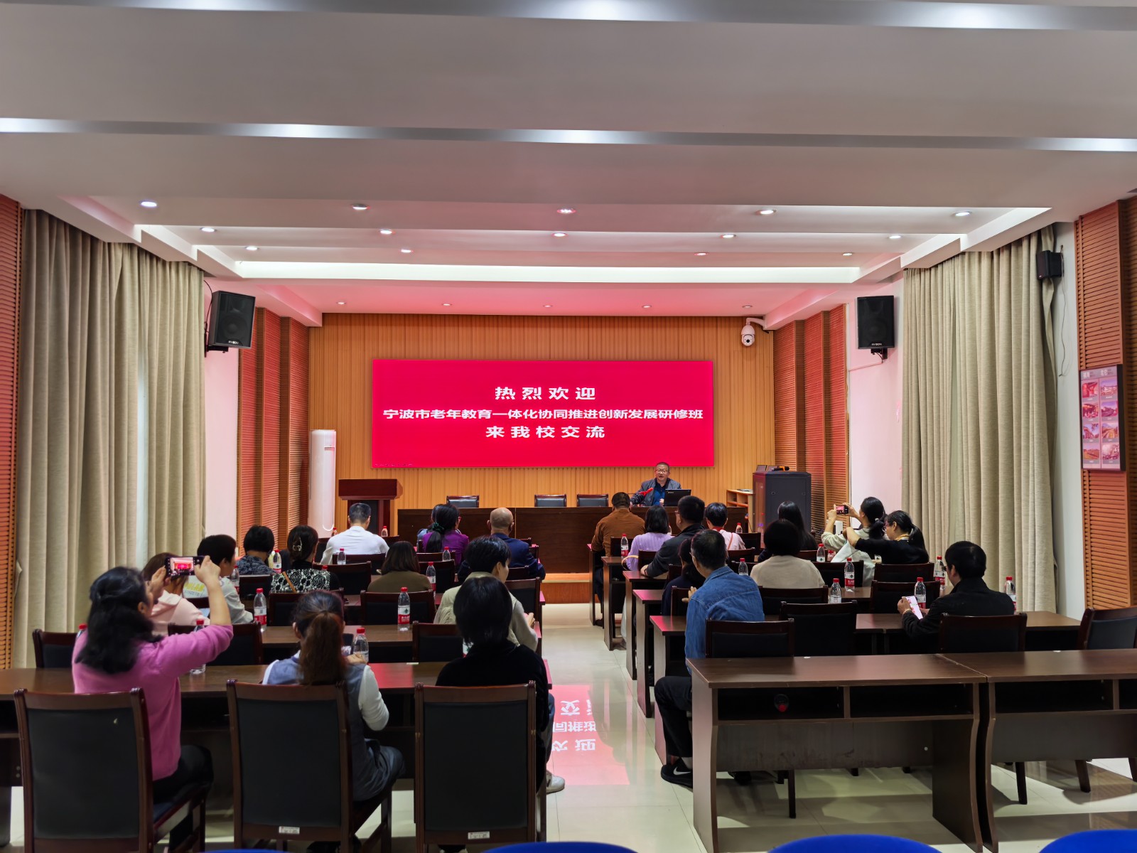 现场实地察看后,在学校报告厅,刘建国校长以“构建立体终身教育平台,服务多样社区学习需求”为主题,以慈城镇成校老年教育的发展为主线,与研修班成员作了深刻交流。