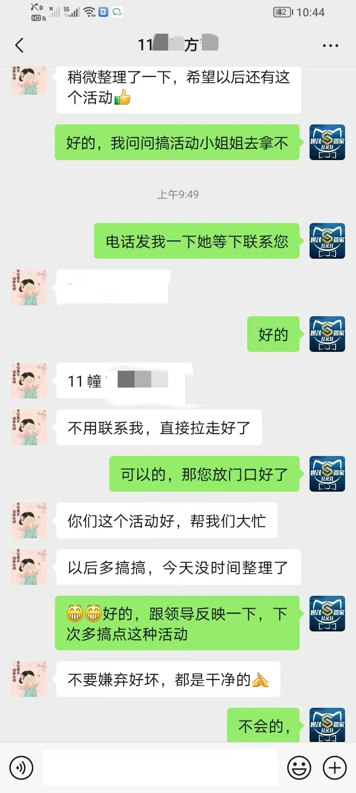家住11幢的居民方女士一大早给物业管家发来了微信“我要出门上班,可以把衣服放在家门口,你们来帮我拿走吗?”鉴于还有些居民因为工作的缘故没法来到活动现场,网格员向居民收集了需求,和志愿者一同上门,将居民的爱心一件件收集。