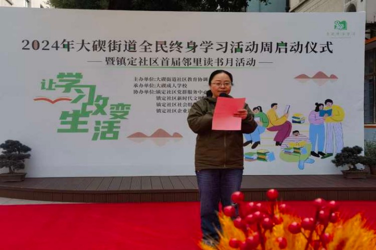 11月22日,大碶成校在镇定社区老年活动广场隆重举行了2024年大碶街道全民终身学习活动周启动仪式,同时揭开了镇定社区首届邻里读书月活动的序幕。大碶街道社会事务科科长李立盈,大碶成人学校校长王财定、镇定社区党委书记邹凌云、镇定社区老年协会常务副会长邬志明等盛情出席。此次活动旨在深化全民终身学习理念,促进社区文化的繁荣发展,吸引了来自大碶街道各社区的居民、学生、教师及社会各界人士参加。
