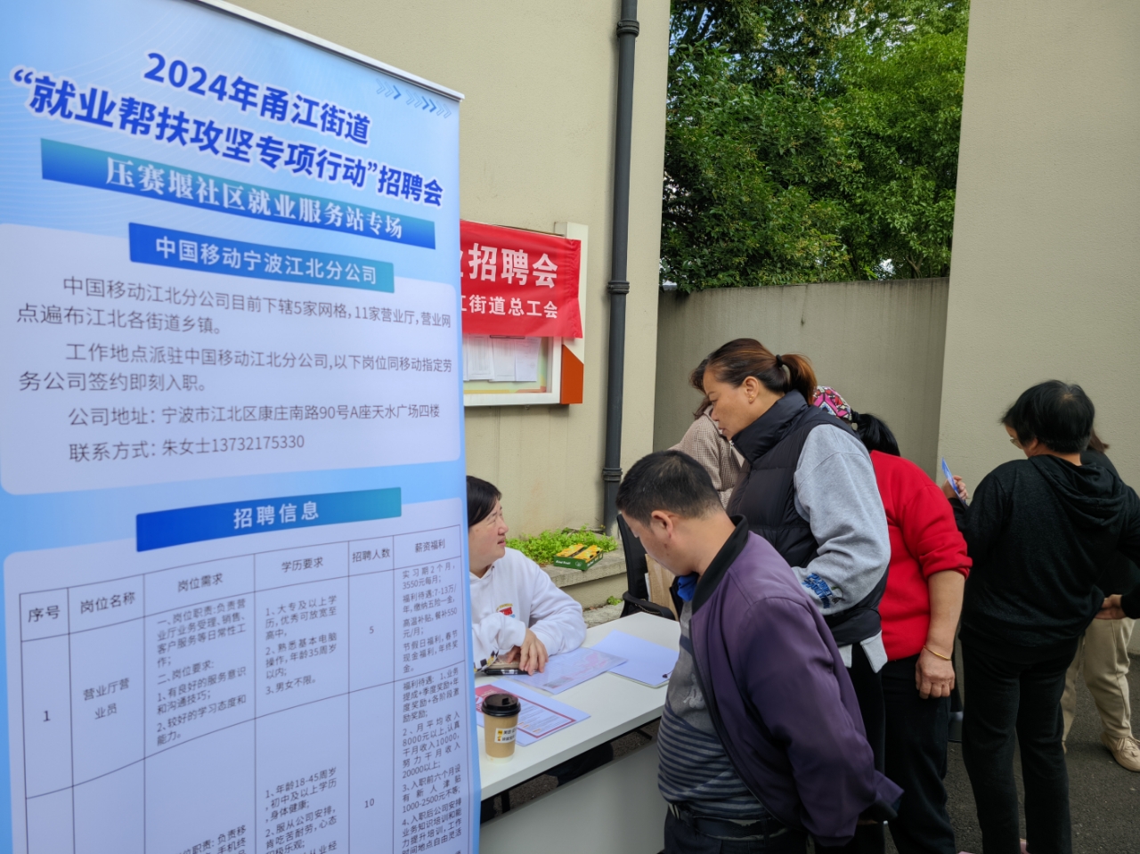 在江北区人社局的指导下,甬江街道压赛堰社区设立“家门口”的社区就业服务站,力求为居民提供更加贴心、高效的就业服务。