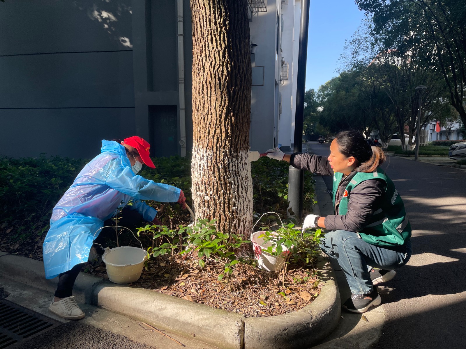 现场热闹非凡,志愿‘红’忙碌地穿梭在绿树从中,有人负责调配石灰涂料有人负责为树木涂刷,还有人负责清理现场……“天气变冷了,人要添衣保暖,树木同样需要保暖”网格员叶菱燕暖心说道。经过数小时的辛勤劳动,小区的树木都被均匀地涂上了白色防护层。在阳光下,白色的树干显得格外醒目,为小区增添了一抹亮丽的色彩。