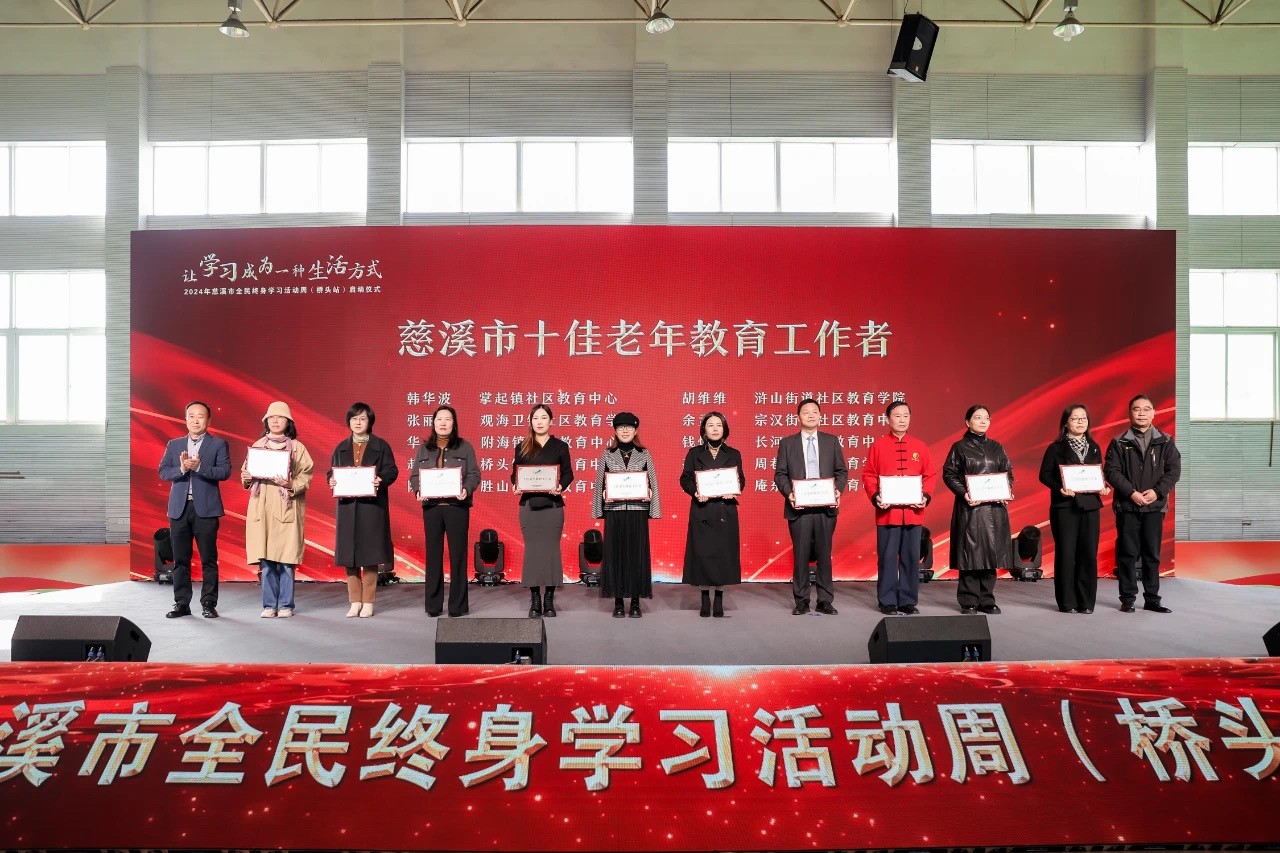 现场还对2024年全国新时代“百姓学习之星”、浙江省现代化学校、宁波市终身教育“双高”建设工程项目、“终身学习品牌项目”等获奖代表进行了表彰,并聘请时代楷模钱海军、世界技能大赛冠军周烽担任慈溪市终身教育特聘导师,引领更多市民崇尚学习、乐于学习、善于学习。