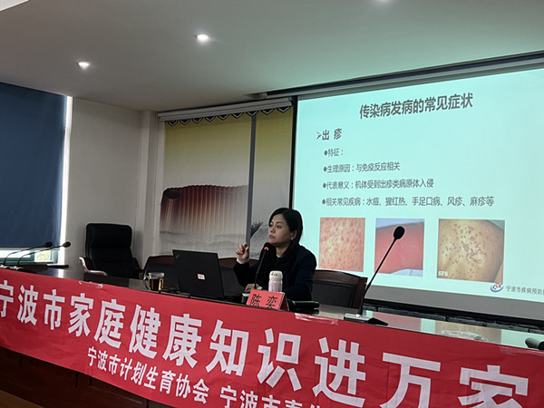 讲座活动中,宁波市疾控中心副主任陈奕对流行性感冒、结核病、登革热、艾滋病、肺炎链球菌感染、水痘-带状疱疹等常见传染病,从传染病的概念、传染源、传播途径、易感人群、防控措施等方面为现场群众进行了深入浅出的讲解,手把手、面对面教授相应防控知识,引导居民养成健康的生活方式