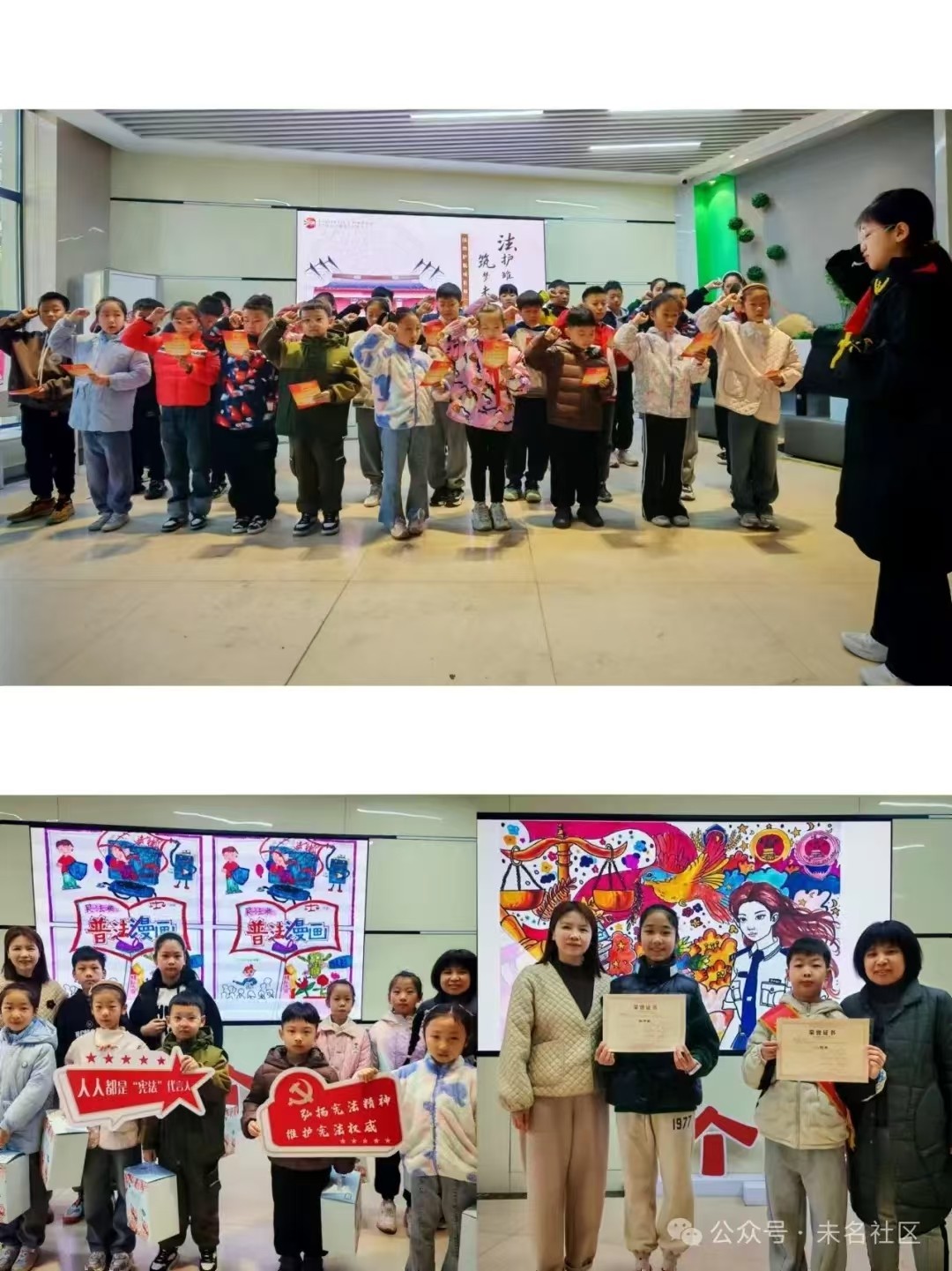 各类普法游戏摊位前人头攒动,居民们积极参与,乐在其中。“宪”留下你的微笑吧!拍照打卡区成为了一大亮点,居民们纷纷驻足,用镜头记录下这难忘的时刻。同时,大屏上循环播放着“普法有‘画’说——农民画、法治漫画作品征集”活动的获奖作品,展现了蛟川辖区居民对法治文化的独特理解和创意表达。社区网格长为小小获奖者们颁发奖品,鼓励他们继续创作,传播法治正能量。