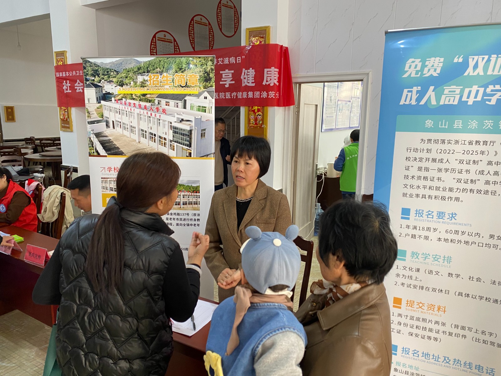 活动中,涂茨镇成人学校的三位老师也在现场为村民们详细讲解了老年学校和双证制高中学历的相关招生信息。老年学校开设了许多课程,包括广场舞、古典舞、门球、越剧及非遗绳编等,有不少村民对学校的课程设置表现出了浓厚的兴趣。同时,双证制高中的招生信息也吸引了众多年轻村民的关注,他们希望通过学习为自己的未来增添更多可能性。