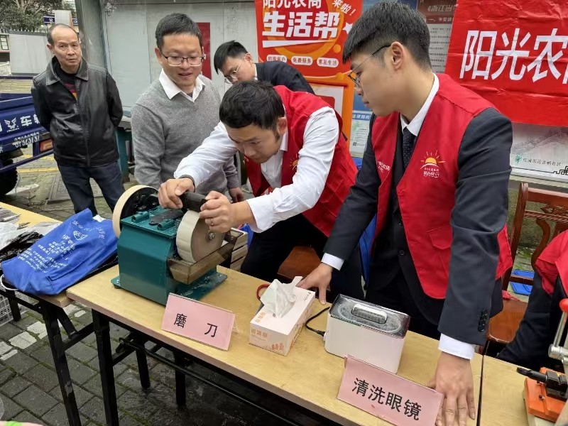 活动现场,各类志愿服务摊位整齐排列,有磨刀、洗眼镜、配钥匙、理发、健康义诊、手工钩织等等。除了便民服务之外,还有政策、反诈、环保、志愿服务精神等宣传。居民们穿梭在摊位之间享受着志愿服务惠民的盛宴。