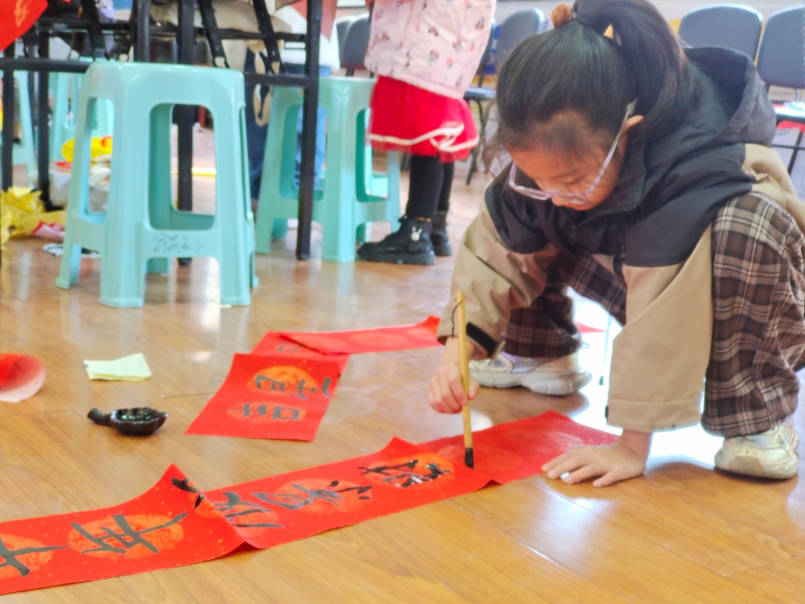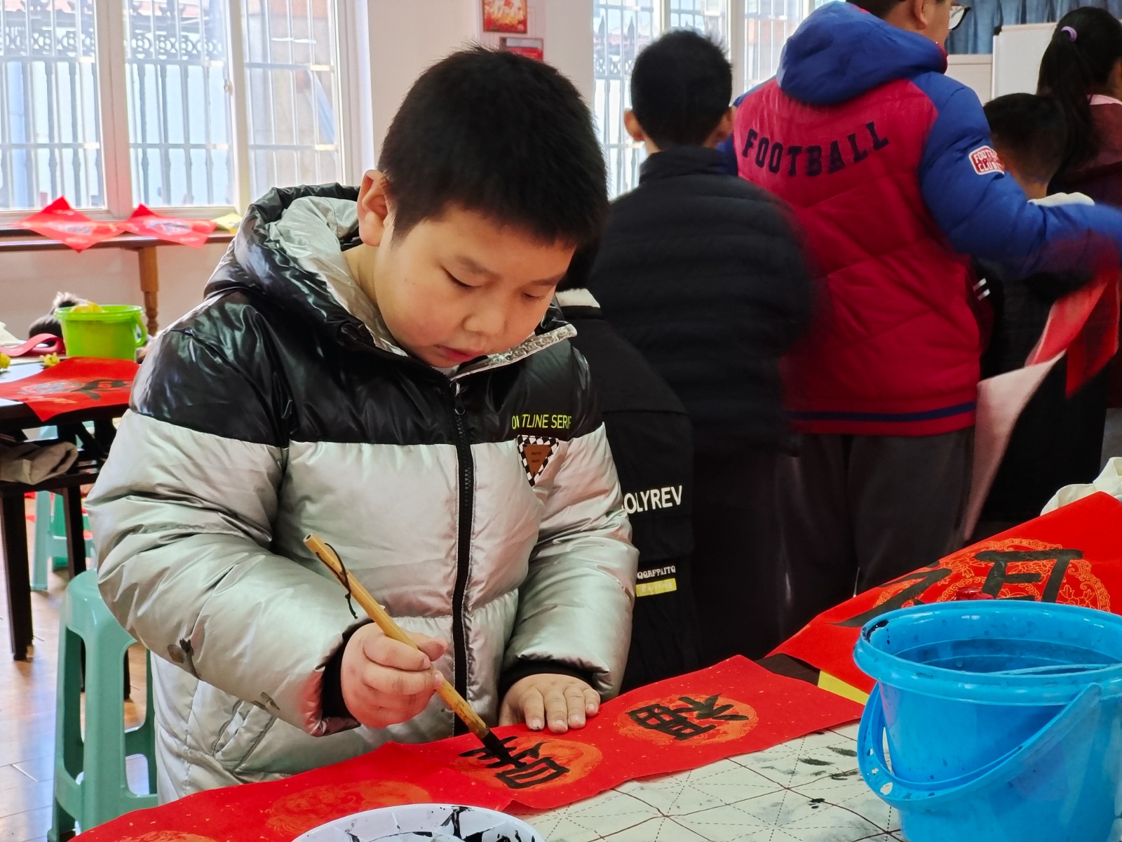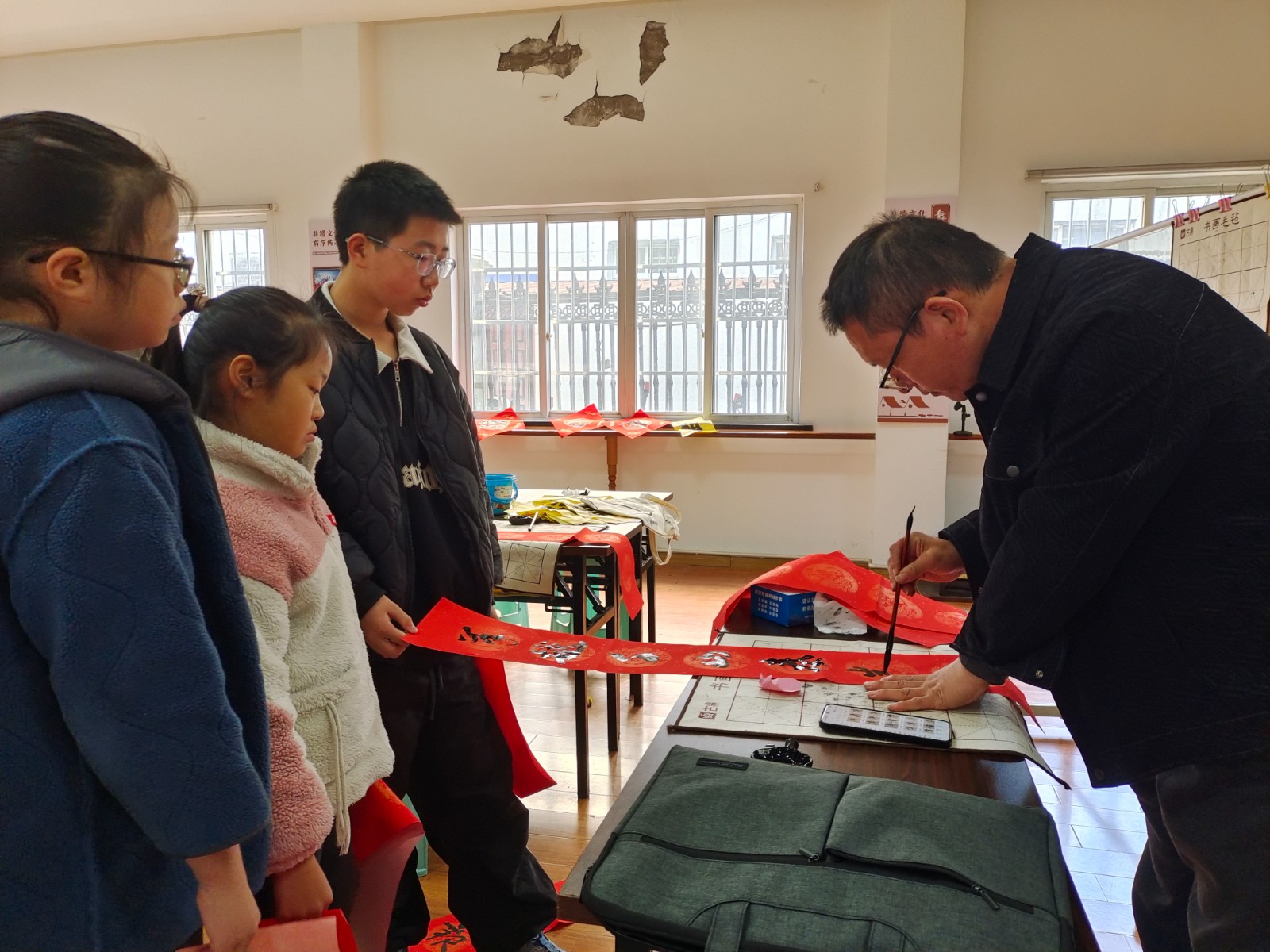 随着“福”字逐渐熟练,网格员为孩子们送上了喜庆的红纸。有的孩子继续书写“福”字,有的则拿出了自己精心准备的对联内容,开始挥毫创作。还有的孩子拿着红纸,请王老师为他们题写一幅对联,以祈求新年的好运与祝福。
