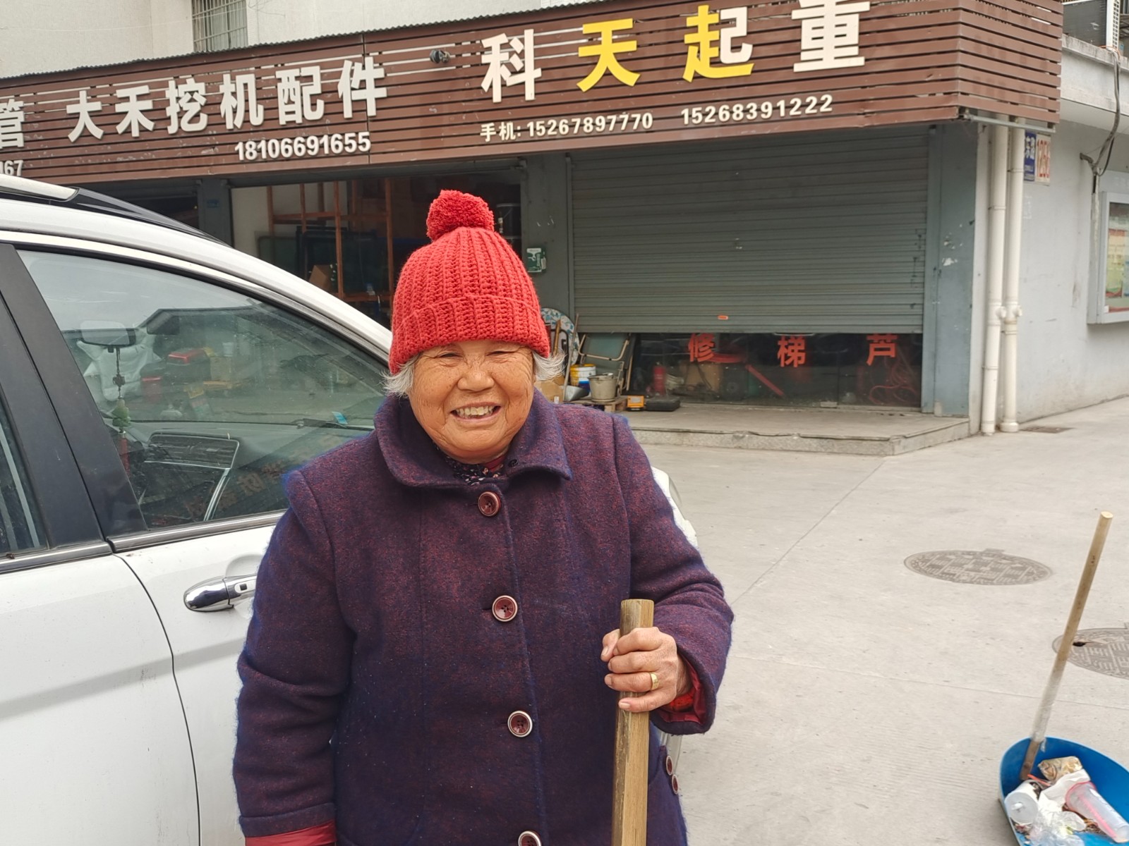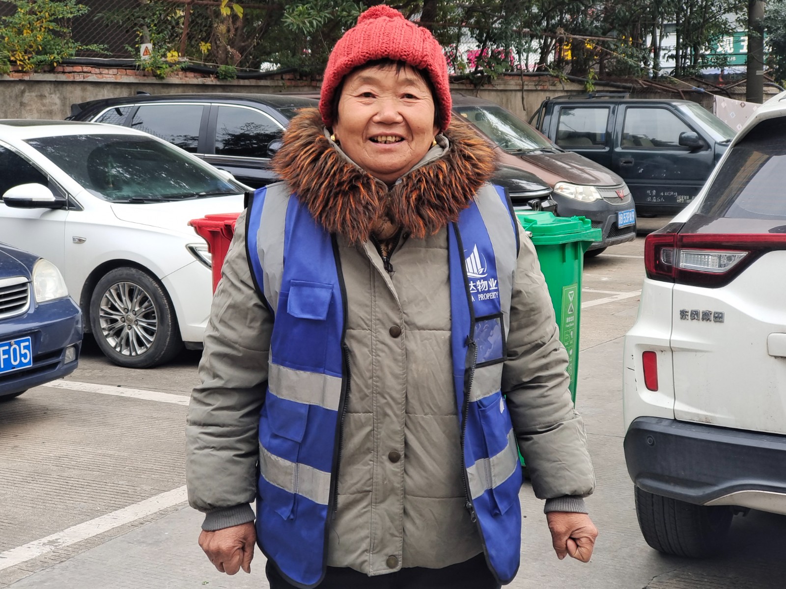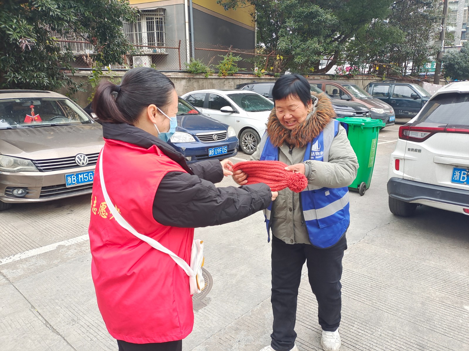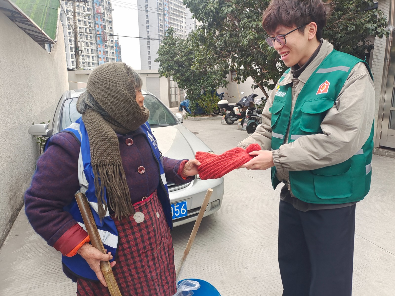 “太感谢啦,我正想着去买顶帽子,你们就送来了!”收到帽子的桶边督导员王阿姨立马摘下包在头上的围巾,戴上了这顶充满邻里温暖的“小红帽”。